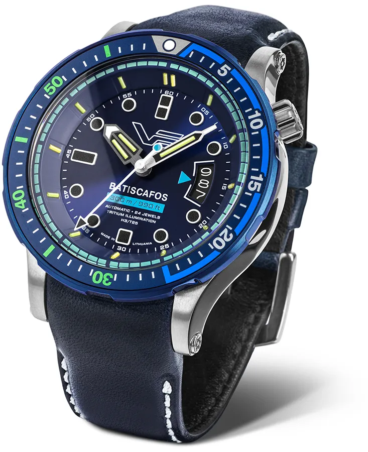 A VOSTOK EUROPE BATISCAFOS AUTOMATIC NH35 511E768-LS karóra 30 BAR nyomásig fokozottan vízálló, ezüstszínű nemesacél tokkal, tükröződésmentesített edzett kristályüveggel, búvár lünettával, átlátszó hátlappal, kék színű valódi bőrszíjjal készül. A mechanikus szerkezetet egy rugó működteti, melyet a kéz mozgása húz fel automatikusan. A megbízható működés eléréséhez kb. 8 óra aktív mozgásra van szükség. Az óráról a pontos idő mellett leolvasható a nap is.