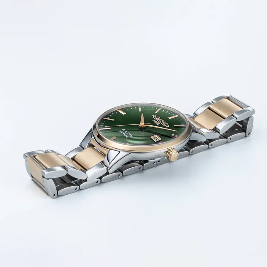 A ROAMER R-LINE CLASSIC 718833487570 karóra 5 BAR nyomásig alapszinten vízálló, bicolor ( többszínű ) nemesacél tokkal, domború fokozottan karcálló zafír kristályüveggel, bicolor ( többszínű ) tömör szemekből álló acélcsattal, nyitáskönnyített pillangózáras csatközéppel készül. Az órát pontos quartz óraszerkezet működteti, mely elemmel működik (kb. 3 év az elem várható élettartama). Az óráról a pontos idő mellett leolvasható a nap is.