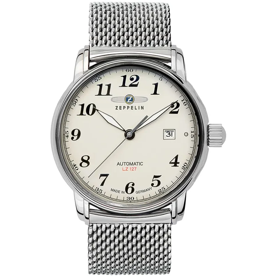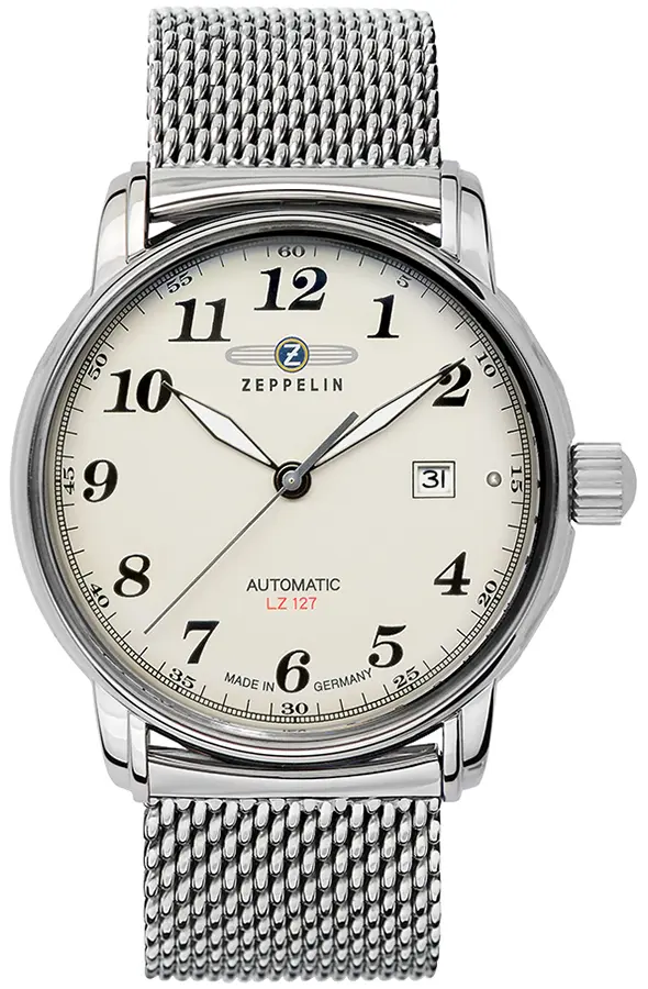 A ZEPPELIN LZ 127 GRAF ZEPPELIN AUTOMATIC 7656M-5 karóra 5 BAR nyomásig alapszinten vízálló, ezüstszínű nemesacél tokkal, domború edzett kristályüveggel, átlátszó hátlappal, ezüstszínű acélcsattal, nyitáskönnyített pillangózáras csatközéppel készül. A mechanikus szerkezetet egy rugó működteti, melyet a kéz mozgása húz fel automatikusan. A megbízható működés eléréséhez kb. 8 óra aktív mozgásra van szükség. Az óráról a pontos idő mellett leolvasható a nap is.