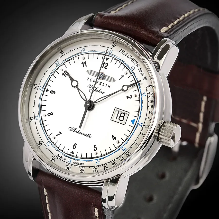 A ZEPPELIN LZ 127 GRAF ZEPPELIN AUTOMATIC OPEN HEART 7664-1 karóra 5 BAR nyomásig alapszinten vízálló, aranyszínű nemesacél tokkal, domború edzett kristályüveggel, átlátszó hátlappal, barna színű valódi bőrszíjjal készül. A mechanikus szerkezetet egy rugó működteti, melyet a kéz mozgása húz fel automatikusan. A megbízható működés eléréséhez kb. 8 óra aktív mozgásra van szükség.
