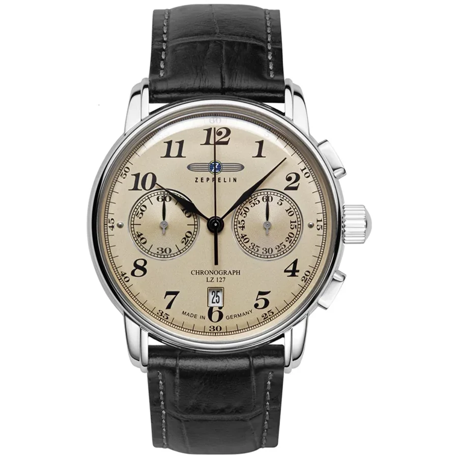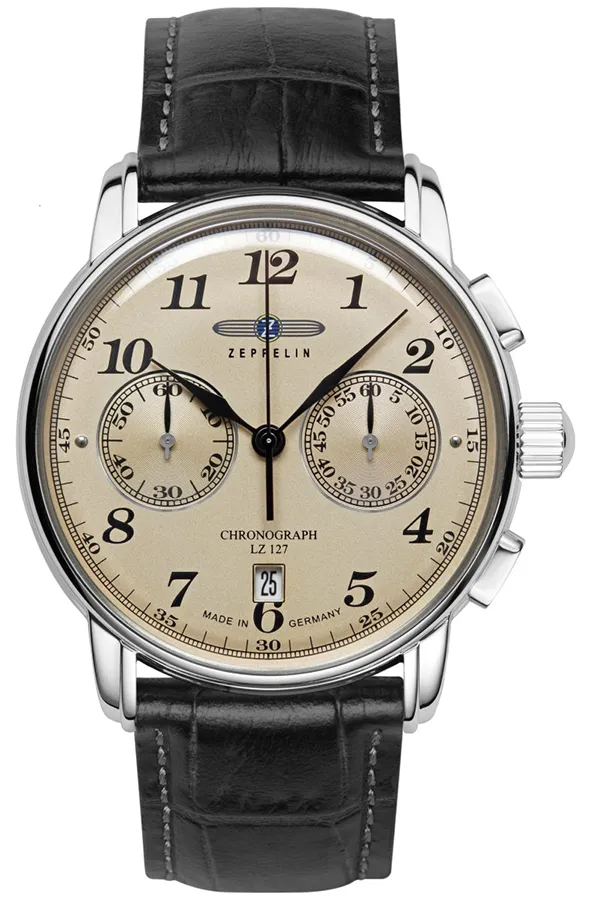 A ZEPPELIN LZ 127 GRAF ZEPPELIN QUARTZ CHRONOGRAPH 7678-5 karóra 5 BAR nyomásig alapszinten vízálló, ezüstszínű nemesacél tokkal, domború edzett kristályüveggel, barna színű valódi bőrszíjjal készül. Az órát pontos quartz óraszerkezet működteti, mely elemmel működik (kb. 3 év az elem várható élettartama). Az óráról a pontos idő mellett leolvasható a nap is. 1/1 másodperces mérési egységű stoppert használhat maximum 60 perc mérési idővel.