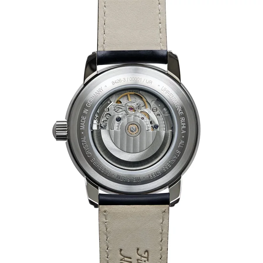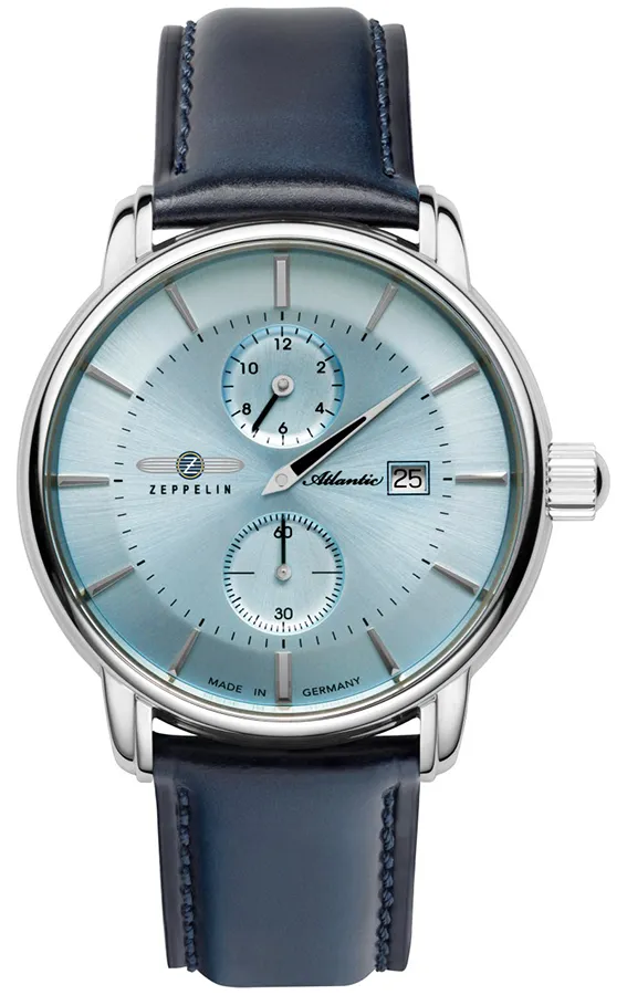 A ZEPPELIN ATLANTIC REGULATOR 8426-3 karóra 5 BAR nyomásig alapszinten vízálló, ezüstszínű nemesacél tokkal, domború fokozottan karcálló zafír kristályüveggel, átlátszó hátlappal, kék színű valódi bőrszíjjal készül. A mechanikus szerkezetet egy rugó működteti, melyet a kéz mozgása húz fel automatikusan. A megbízható működés eléréséhez kb. 8 óra aktív mozgásra van szükség. Az óráról a pontos idő mellett leolvasható a nap is.