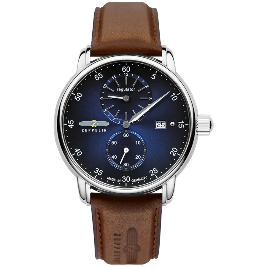 A ZEPPELIN NEW CAPTAIN'S LINE REGULATOR 8622-3 karóra 5 BAR nyomásig alapszinten vízálló, ezüstszínű nemesacél tokkal, domború fokozottan karcálló zafír kristályüveggel, átlátszó hátlappal, barna színű valódi bőrszíjjal készül. A mechanikus szerkezetet egy rugó működteti, melyet a kéz mozgása húz fel automatikusan. A megbízható működés eléréséhez kb. 8 óra aktív mozgásra van szükség. Az óráról a pontos idő mellett leolvasható a nap is.