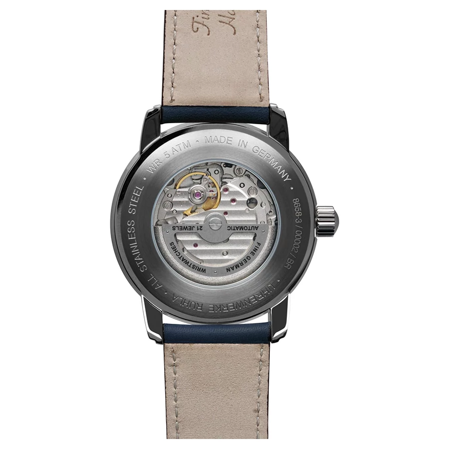 A ZEPPELIN NEW CAPTAIN'S LINE AUTOMATIC SKELETON 8658-3 karóra 5 BAR nyomásig alapszinten vízálló, ezüstszínű nemesacél tokkal, edzett kristályüveggel, átlátszó hátlappal, fekete színű valódi bőrszíjjal készül. A mechanikus szerkezetet egy rugó működteti, melyet a kéz mozgása húz fel automatikusan. A megbízható működés eléréséhez kb. 8 óra aktív mozgásra van szükség.