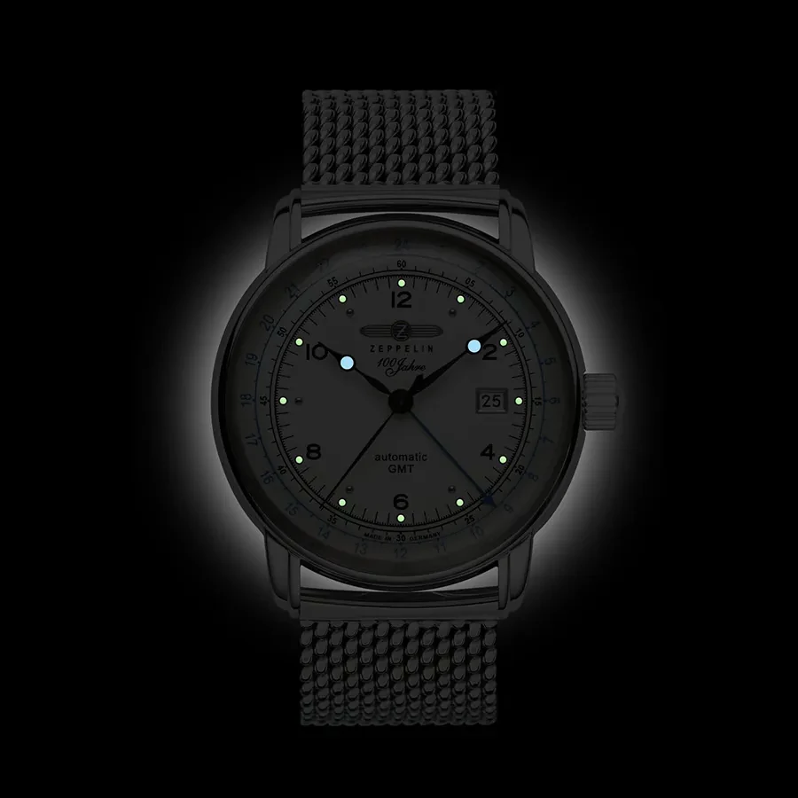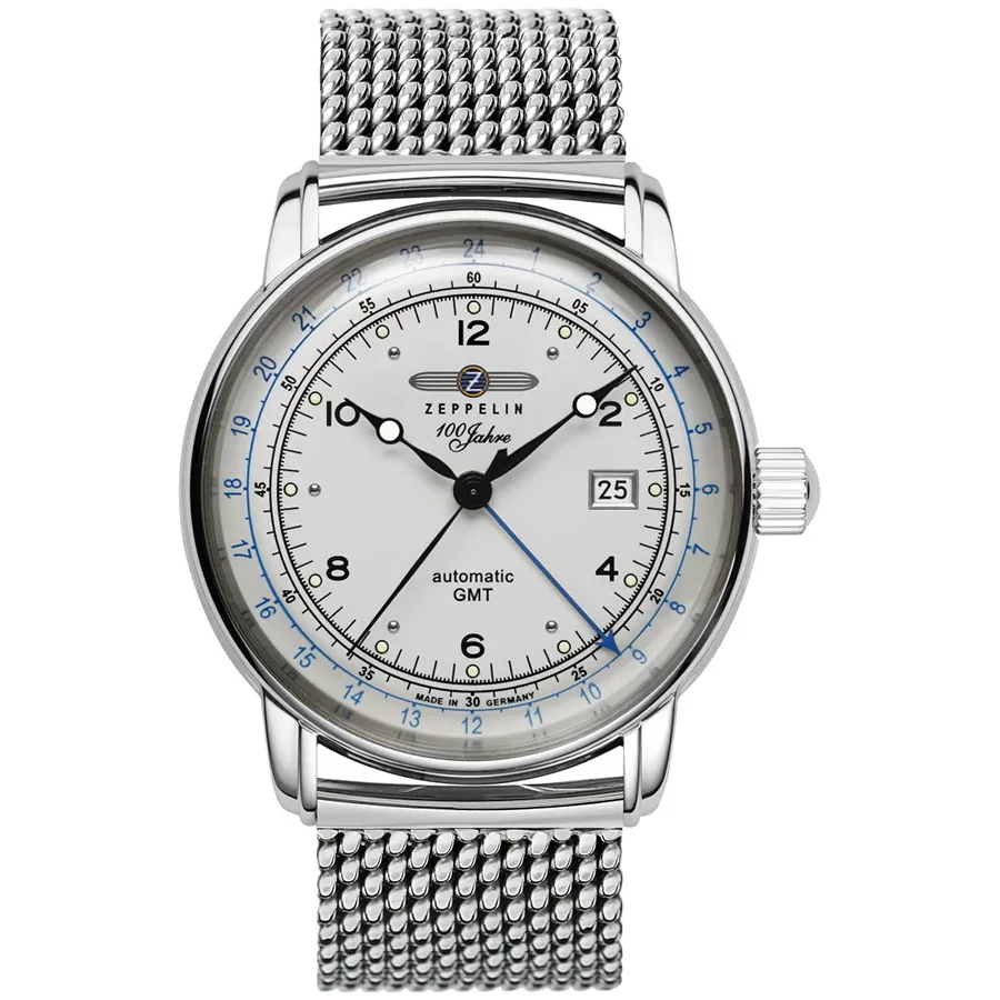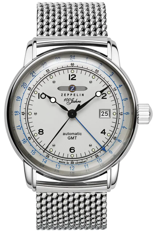 A ZEPPELIN 100 YEARS AUTOMATIC GMT 8666M-1 karóra 5 BAR nyomásig alapszinten vízálló, ezüstszínű nemesacél tokkal, domború edzett kristályüveggel, átlátszó hátlappal, ezüstszínű acélcsattal, nyitáskönnyített pillangózáras csatközéppel készül. A mechanikus szerkezetet egy rugó működteti, melyet a kéz mozgása húz fel automatikusan. A megbízható működés eléréséhez kb. 8 óra aktív mozgásra van szükség. Az óráról a pontos idő mellett leolvasható a nap is. Egy a pontos időtől független időzóna ideje is leolvasható az óráról (DUAL TIME).