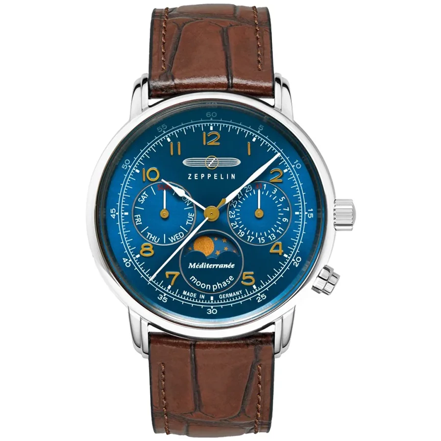 A ZEPPELIN MÉDITERRANÉE MOONPHASE WOMAN 9637-3 karóra 5 BAR nyomásig alapszinten vízálló, ezüstszínű nemesacél tokkal, edzett kristályüveggel, barna színű valódi bőrszíjjal készül. Az órát pontos quartz óraszerkezet működteti, mely elemmel működik (kb. 5 év az elem várható élettartama). Az óráról a pontos idő mellett leolvasható a nap és a nap neve is. Az óráról leolvasható a holdfázis.
