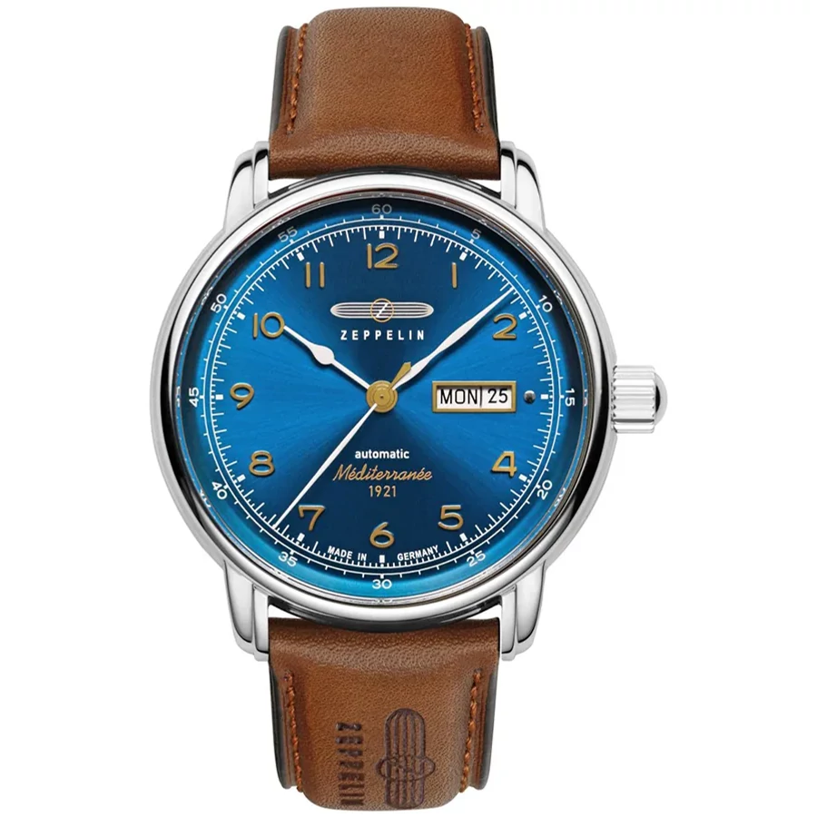 A ZEPPELIN MÉDITERRANÉE AUTOMATIC DAY DATE 9664-3 karóra 5 BAR nyomásig alapszinten vízálló, ezüstszínű nemesacél tokkal, domború edzett kristályüveggel, átlátszó hátlappal, barna színű valódi bőrszíjjal készül. A mechanikus szerkezetet egy rugó működteti, melyet a kéz mozgása húz fel automatikusan. A megbízható működés eléréséhez kb. 8 óra aktív mozgásra van szükség. Az óráról a pontos idő mellett leolvasható a nap és a nap neve is.