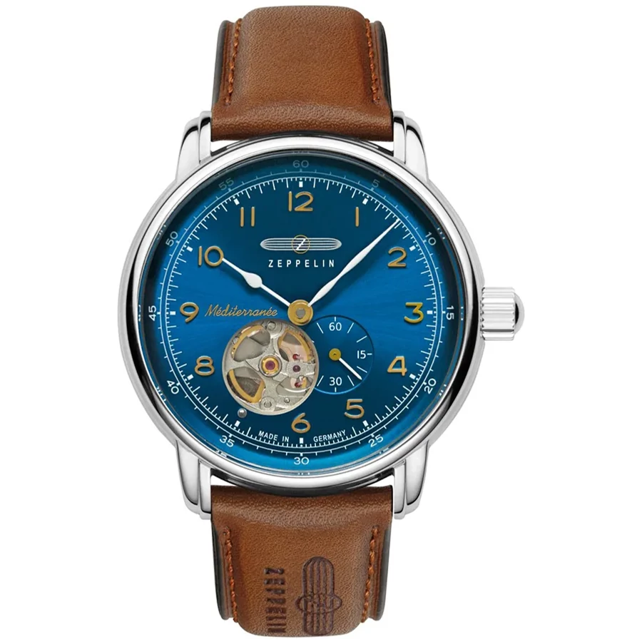 A ZEPPELIN MÉDITERRANÉE AUTOMATIC OPEN HEART 9666-3 karóra 5 BAR nyomásig alapszinten vízálló, ezüstszínű nemesacél tokkal, domború edzett kristályüveggel, átlátszó hátlappal, barna színű valódi bőrszíjjal készül. A mechanikus szerkezetet egy rugó működteti, melyet a kéz mozgása húz fel automatikusan. A megbízható működés eléréséhez kb. 8 óra aktív mozgásra van szükség.