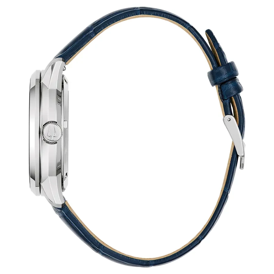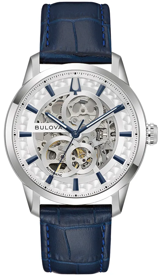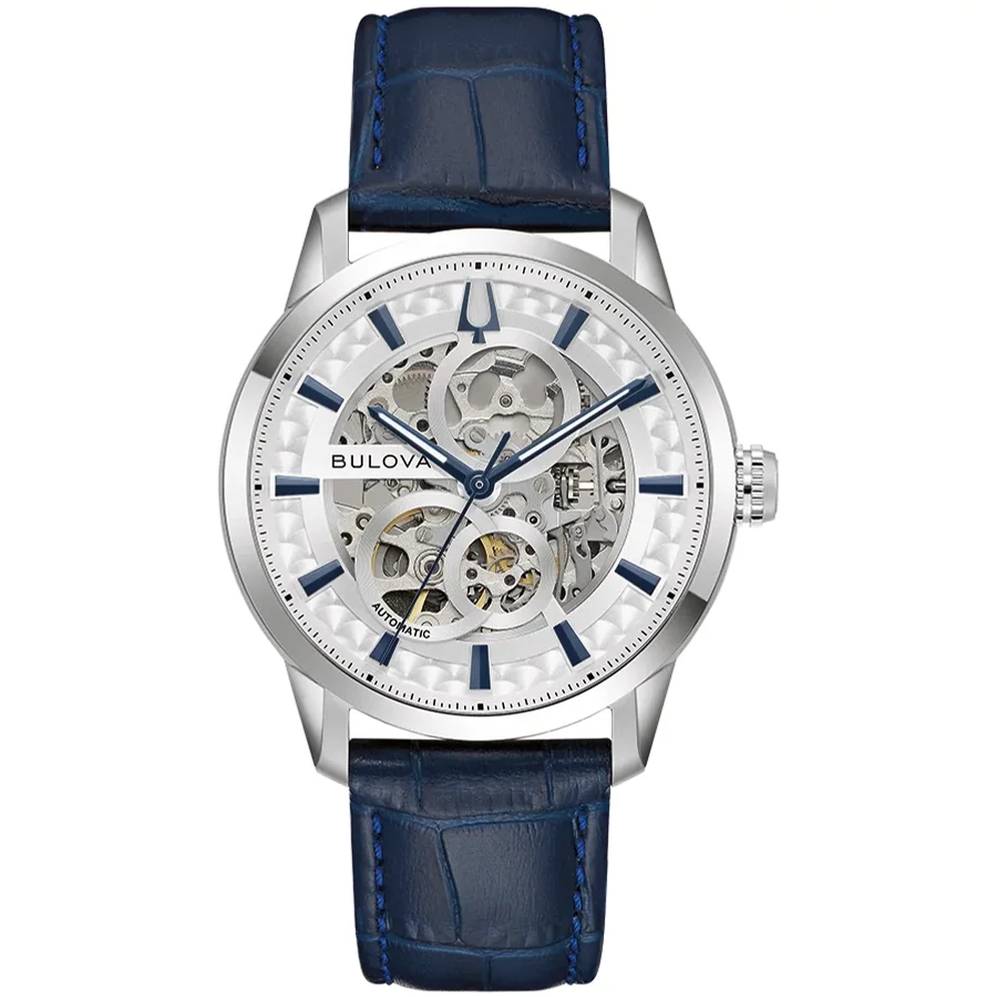 A BULOVA SUTTON AUTOMATIC 3 96A330 karóra cseppálló, ezüstszínű nemesacél tokkal, domború tükröződésmentesített fokozottan karcálló zafír kristályüveggel, átlátszó hátlappal, kék színű valódi bőrszíjjal készül. A mechanikus szerkezetet egy rugó működteti, melyet a kéz mozgása húz fel automatikusan. A megbízható működés eléréséhez kb. 8 óra aktív mozgásra van szükség.