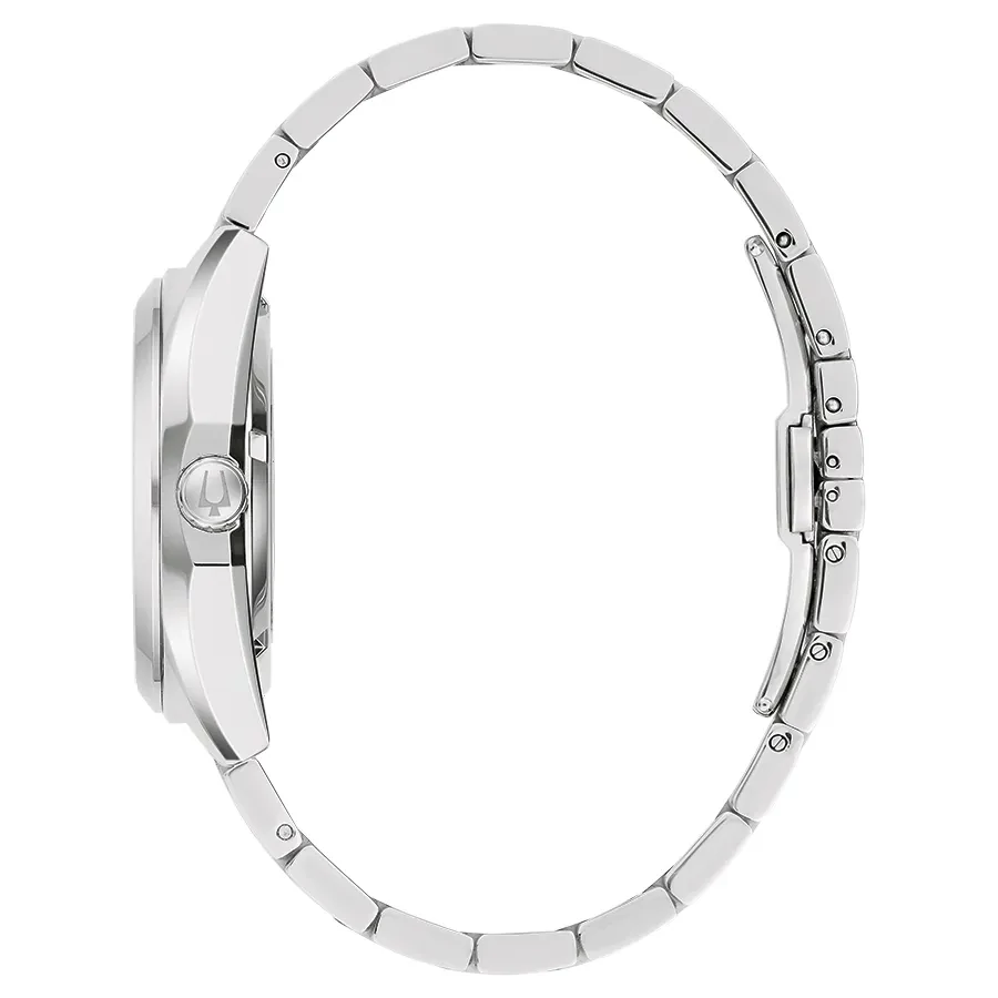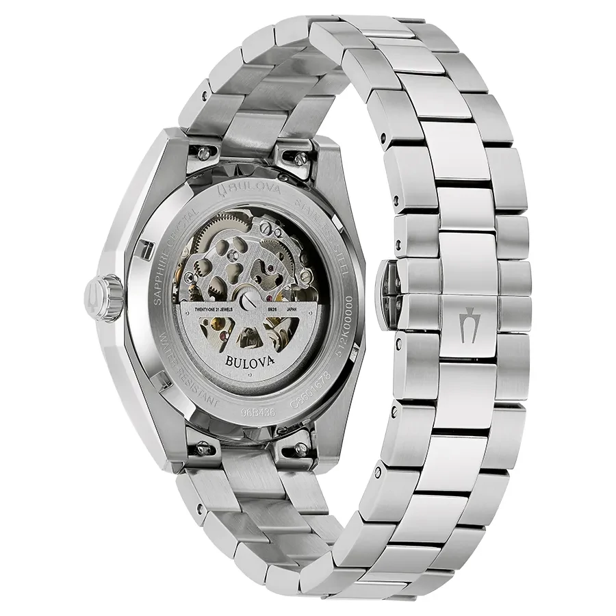 A BULOVA SURVEYOR AUTOMATIC 96B436 karóra cseppálló, ezüstszínű nemesacél tokkal, tükröződésmentesített fokozottan karcálló zafír kristályüveggel, átlátszó hátlappal, ezüstszínű tömör szemekből álló acélcsattal, nyitáskönnyített pillangózáras csatközéppel készül. A mechanikus szerkezetet egy rugó működteti, melyet a kéz mozgása húz fel automatikusan. A megbízható működés eléréséhez kb. 8 óra aktív mozgásra van szükség. Az óráról a pontos idő mellett leolvasható a nap is.