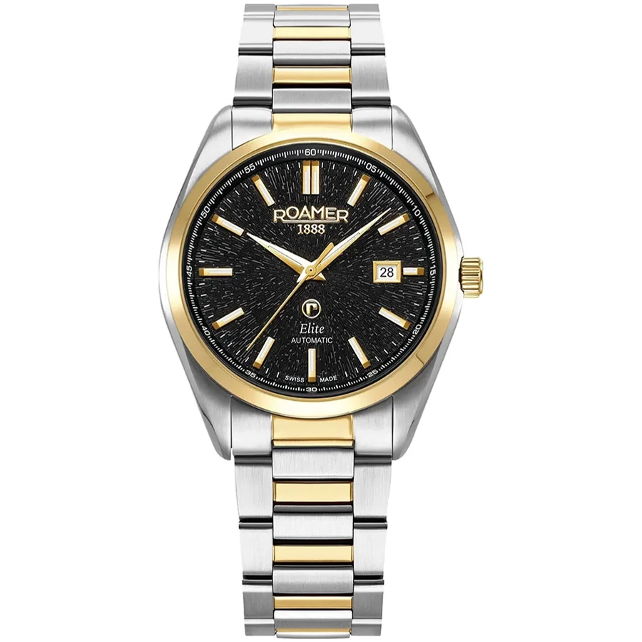 A ROAMER ELITE 970983478520 karóra 5 BAR nyomásig alapszinten vízálló, bicolor ( többszínű ) nemesacél tokkal, fokozottan karcálló zafír kristályüveggel, átlátszó hátlappal, bicolor ( többszínű ) tömör szemekből álló acélcsattal, nyitáskönnyített pillangózáras csatközéppel készül. A mechanikus szerkezetet egy rugó működteti, melyet a kéz mozgása húz fel automatikusan. A megbízható működés eléréséhez kb. 8 óra aktív mozgásra van szükség. Az óráról a pontos idő mellett leolvasható a nap is.