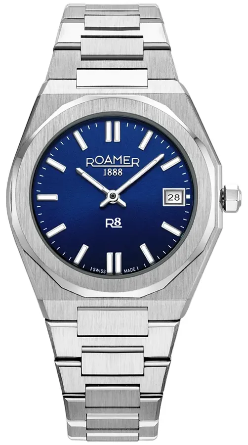A ROAMER R8 LADIES 972857414520 karóra 5 BAR nyomásig alapszinten vízálló, ezüstszínű nemesacél tokkal, fokozottan karcálló zafír kristályüveggel, ezüstszínű tömör szemekből álló acélcsattal, nyitáskönnyített pillangózáras csatközéppel készül. Az órát pontos quartz óraszerkezet működteti, mely elemmel működik (kb. 3 év az elem várható élettartama). Az óráról a pontos idő mellett leolvasható a nap is.