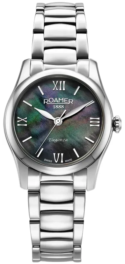 A ROAMER ELEGANZA 974847418020 karóra cseppálló, ezüstszínű nemesacél tokkal, fokozottan karcálló zafír kristályüveggel, menetes hátlappal, ezüstszínű tömör szemekből álló acélcsattal, nyitáskönnyített pillangózáras csatközéppel készül. Az órát pontos quartz óraszerkezet működteti, mely elemmel működik (kb. 5 év az elem várható élettartama).