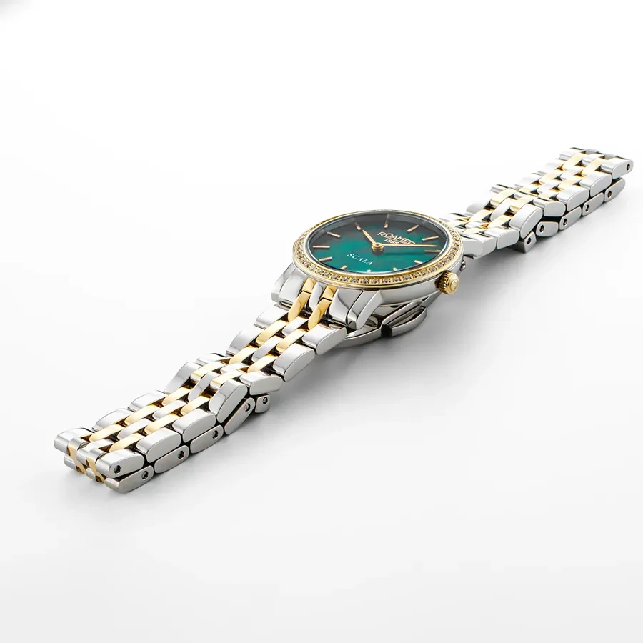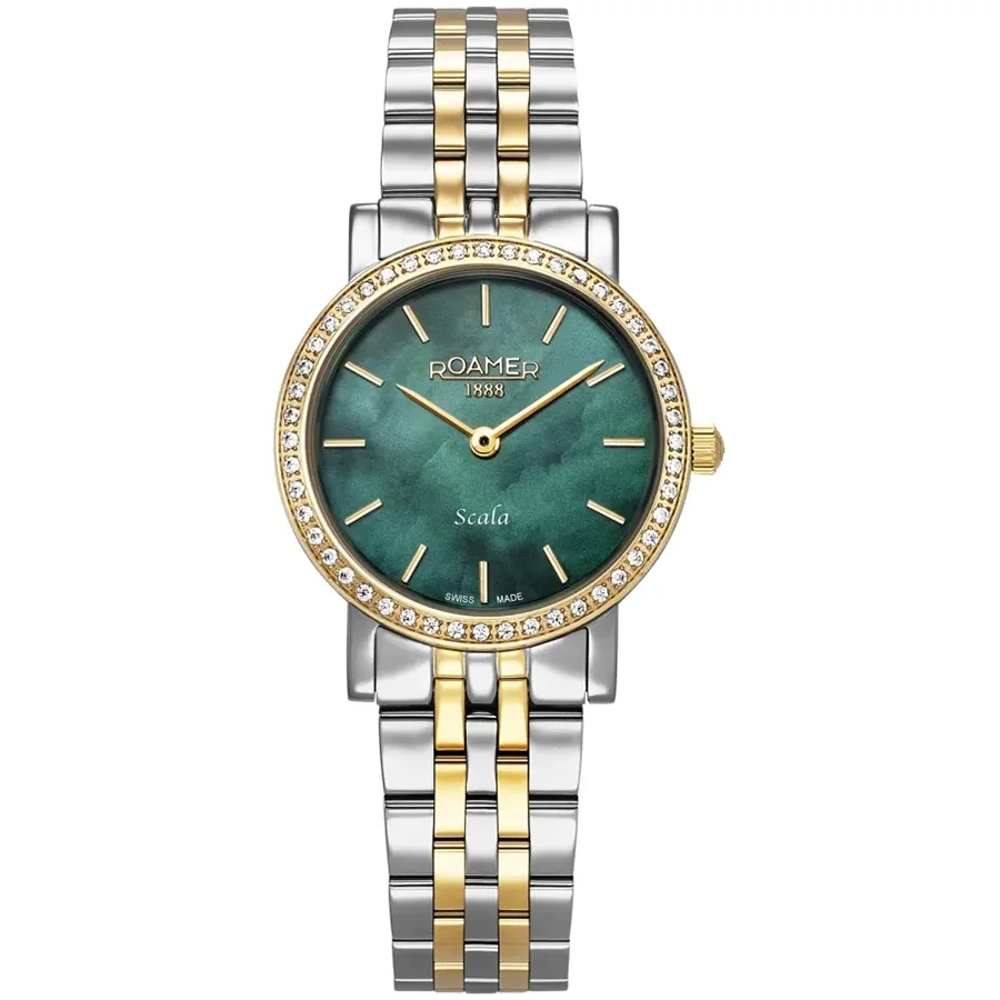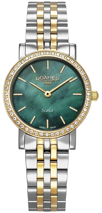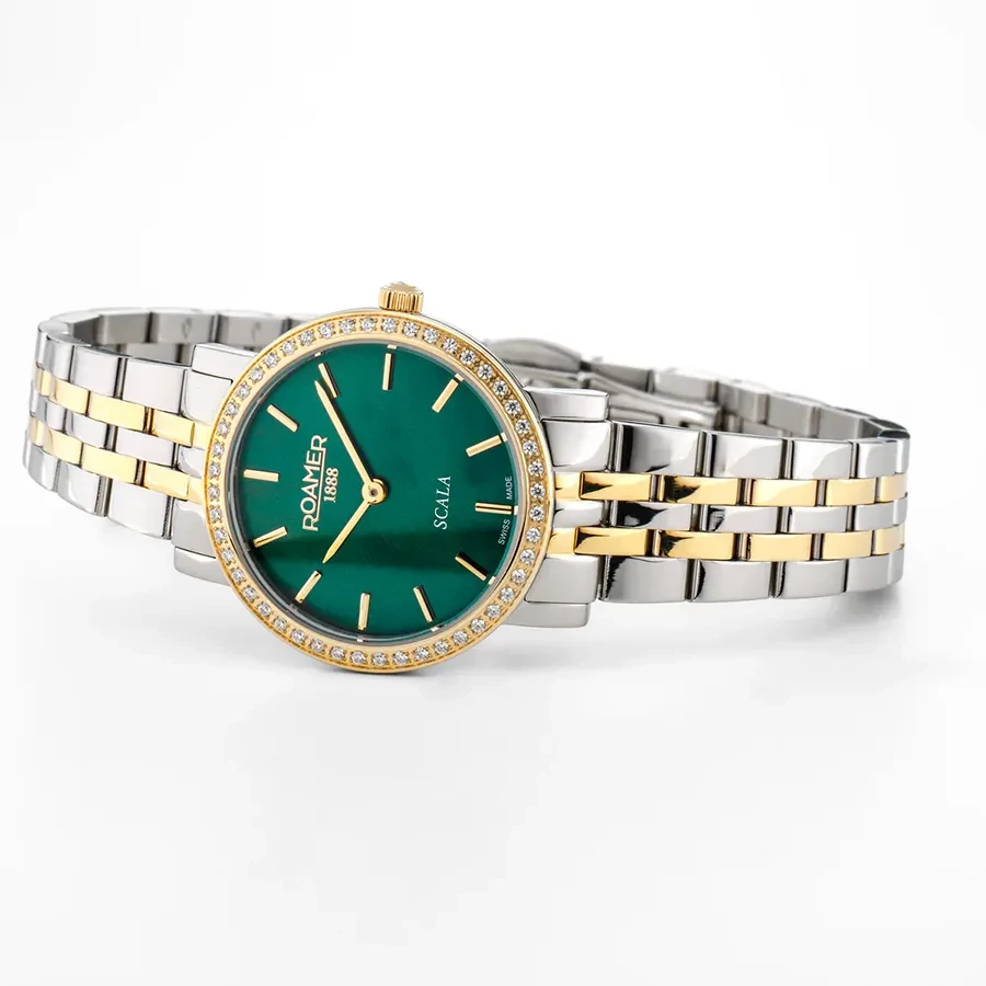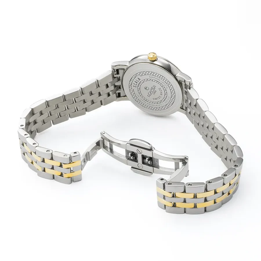 A ROAMER SCALA 976830477050 karóra cseppálló, bicolor ( többszínű ) nemesacél tokkal, fokozottan karcálló zafír kristályüveggel, bicolor ( többszínű ) tömör szemekből álló acélcsattal, nyitáskönnyített pillangózáras csatközéppel készül. Az órát pontos quartz óraszerkezet működteti, mely elemmel működik (kb. 5 év az elem várható élettartama).