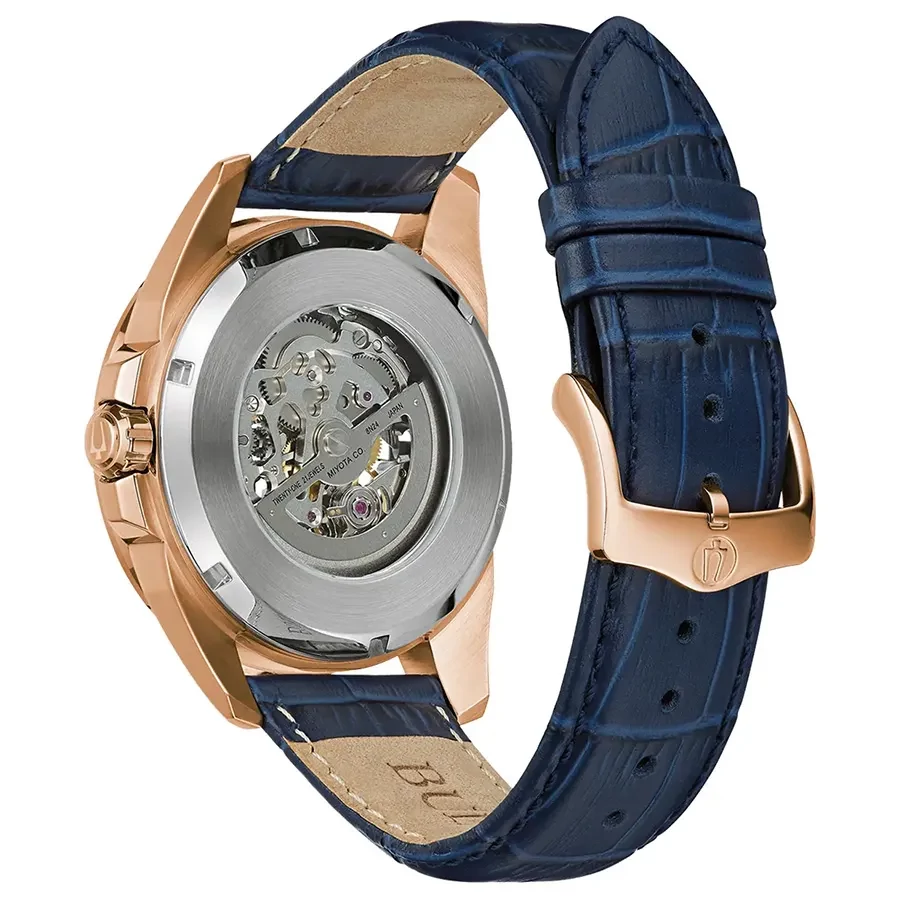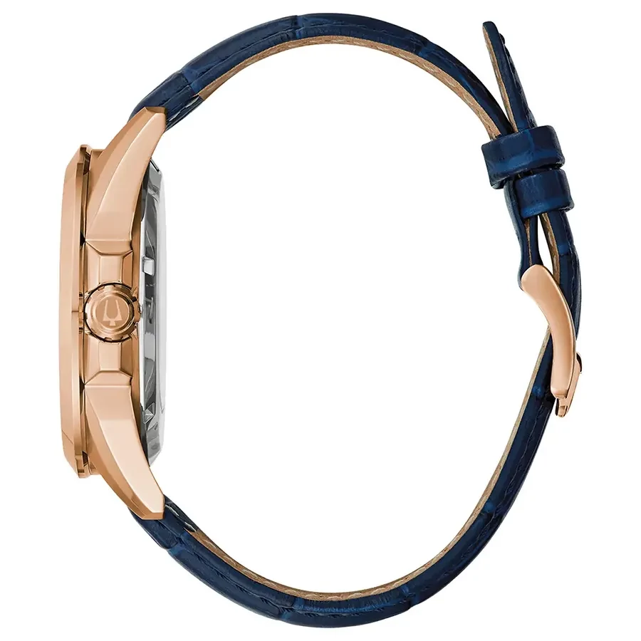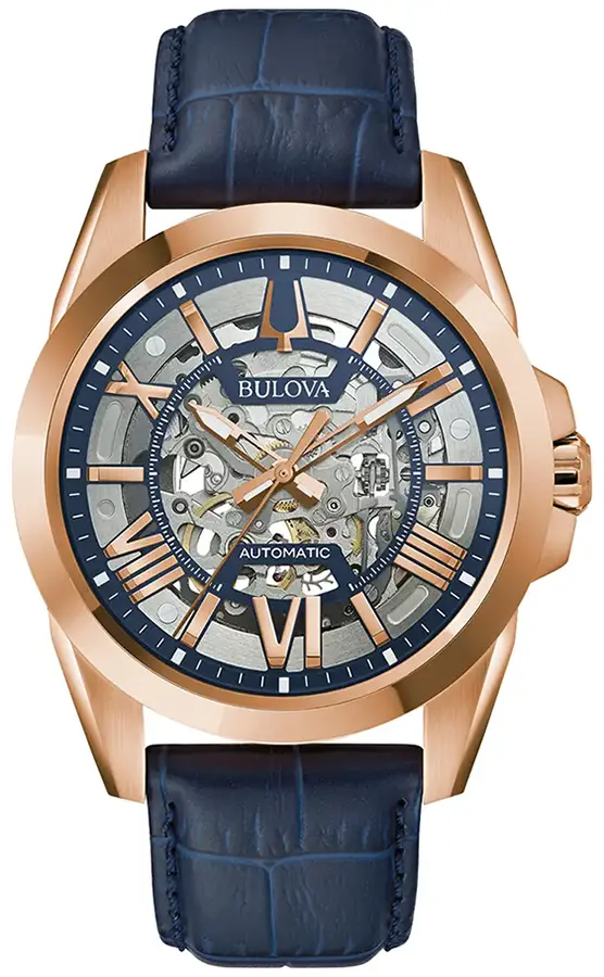 A BULOVA SUTTON AUTOMATIC 97A161 karóra 10 BAR nyomásig fokozottan vízálló, rozé ( rózsa arany ) színű nemesacél tokkal, edzett kristályüveggel, átlátszó hátlappal, kék színű valódi bőrszíjjal készül. A mechanikus szerkezetet egy rugó működteti, melyet a kéz mozgása húz fel automatikusan. A megbízható működés eléréséhez kb. 8 óra aktív mozgásra van szükség.