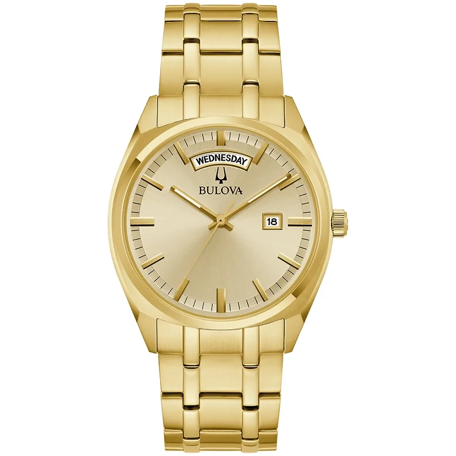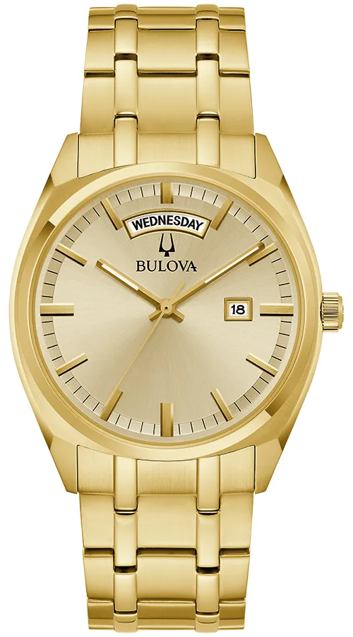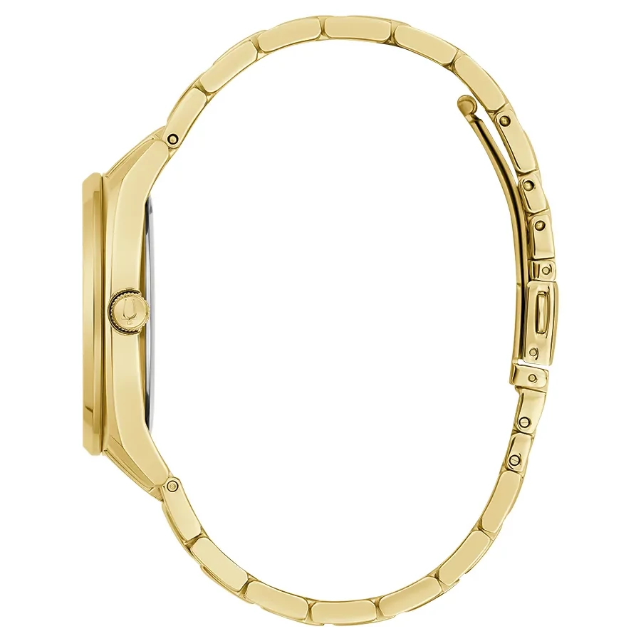 A BULOVA SURVEYOR CLASSIC 97C115 karóra cseppálló, aranyszínű nemesacél tokkal, edzett kristályüveggel, aranyszínű tömör szemekből álló acélcsattal, nyitáskönnyített csatközéppel készül. Az órát pontos quartz óraszerkezet működteti, mely elemmel működik (kb. 3 év az elem várható élettartama). Az óráról a pontos idő mellett leolvasható a nap és a nap neve is.