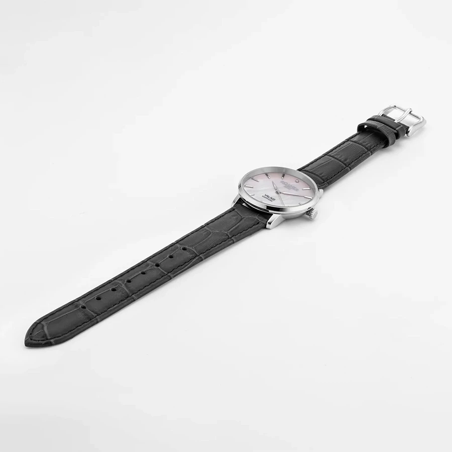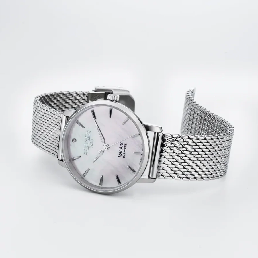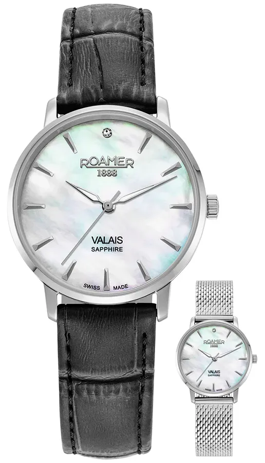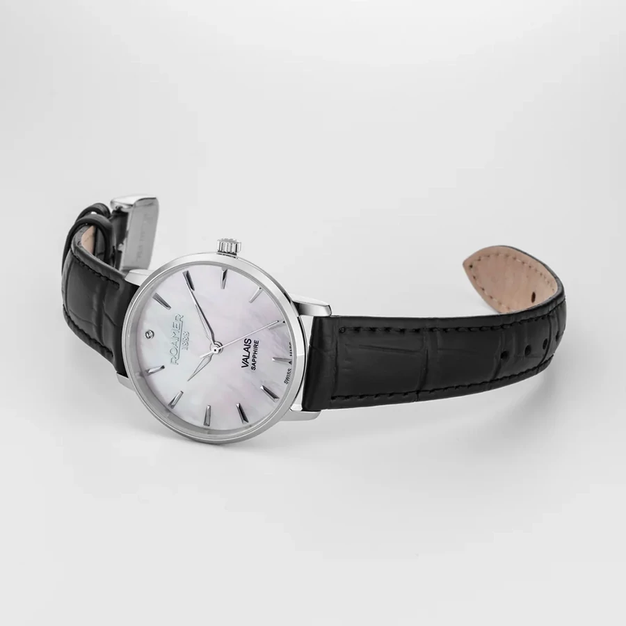 A ROAMER VALAIS LADIES DIAMOND SET 989847412005 karóra 5 BAR nyomásig alapszinten vízálló, ezüstszínű nemesacél tokkal, tükröződésmentesített fokozottan karcálló zafír kristályüveggel, fekete színű valódi bőrszíjjal készül. Az órát pontos quartz óraszerkezet működteti, mely elemmel működik (kb. 3 év az elem várható élettartama). Az órát valódi gyémánt díszíti.