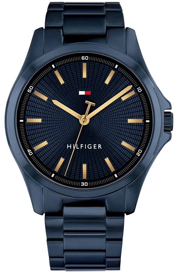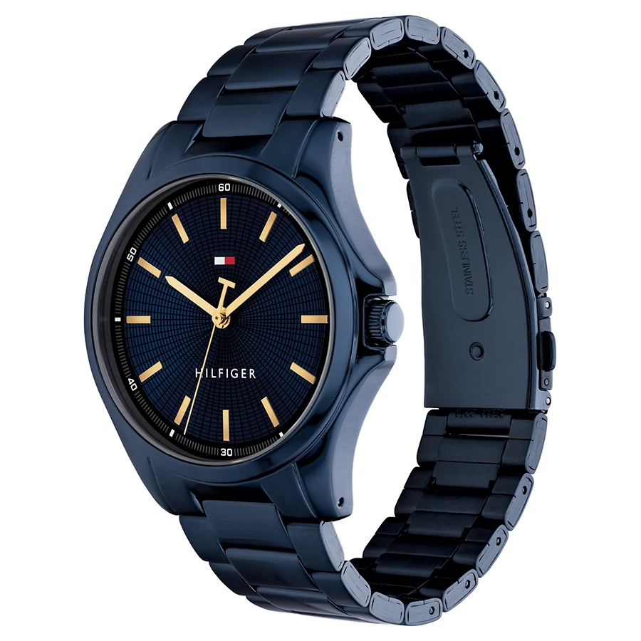 A TOMMY HILFIGER BRUCE BTH17107423 karóra cseppálló, kék színű nemesacél tokkal, edzett kristályüveggel, menetes hátlappal, kék színű acélcsattal, nyitáskönnyített csatközéppel készül. Az órát pontos quartz óraszerkezet működteti, mely elemmel működik (kb. 3 év az elem várható élettartama).