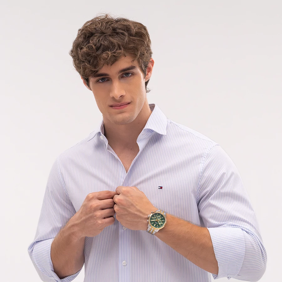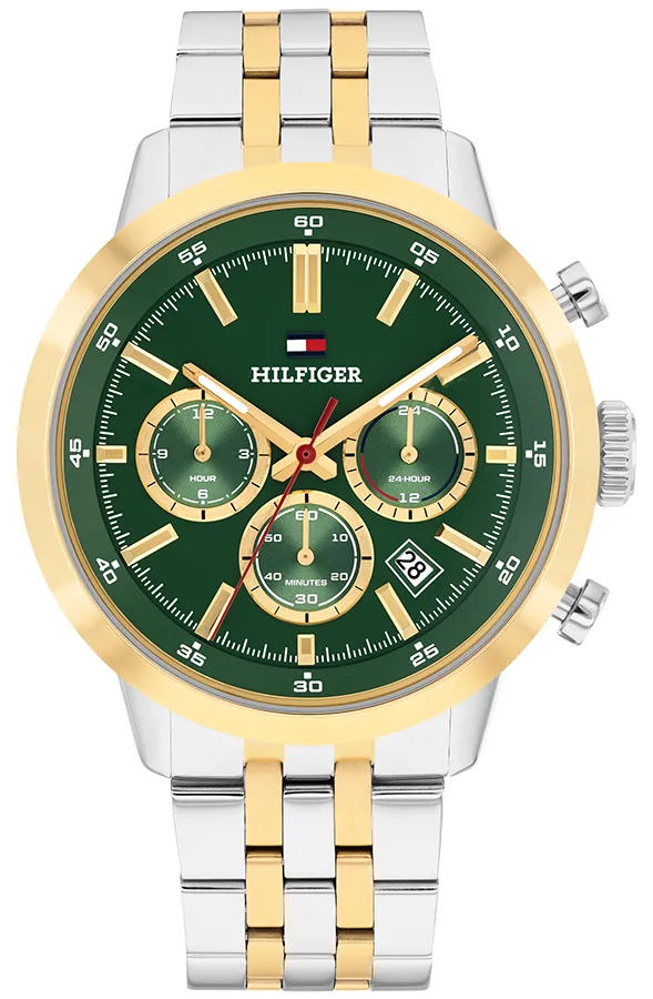 A TOMMY HILFIGER KENT BTH17107543 karóra 5 BAR nyomásig alapszinten vízálló, bicolor ( többszínű ) nemesacél tokkal, edzett kristályüveggel, menetes hátlappal, bicolor ( többszínű ) acélcsattal, nyitáskönnyített csatközéppel készül. Az órát pontos quartz óraszerkezet működteti, mely elemmel működik (kb. 3 év az elem várható élettartama). Az óráról a pontos idő mellett leolvasható a nap is. Egy a pontos időtől független időzóna ideje is leolvasható az óráról (DUAL TIME).