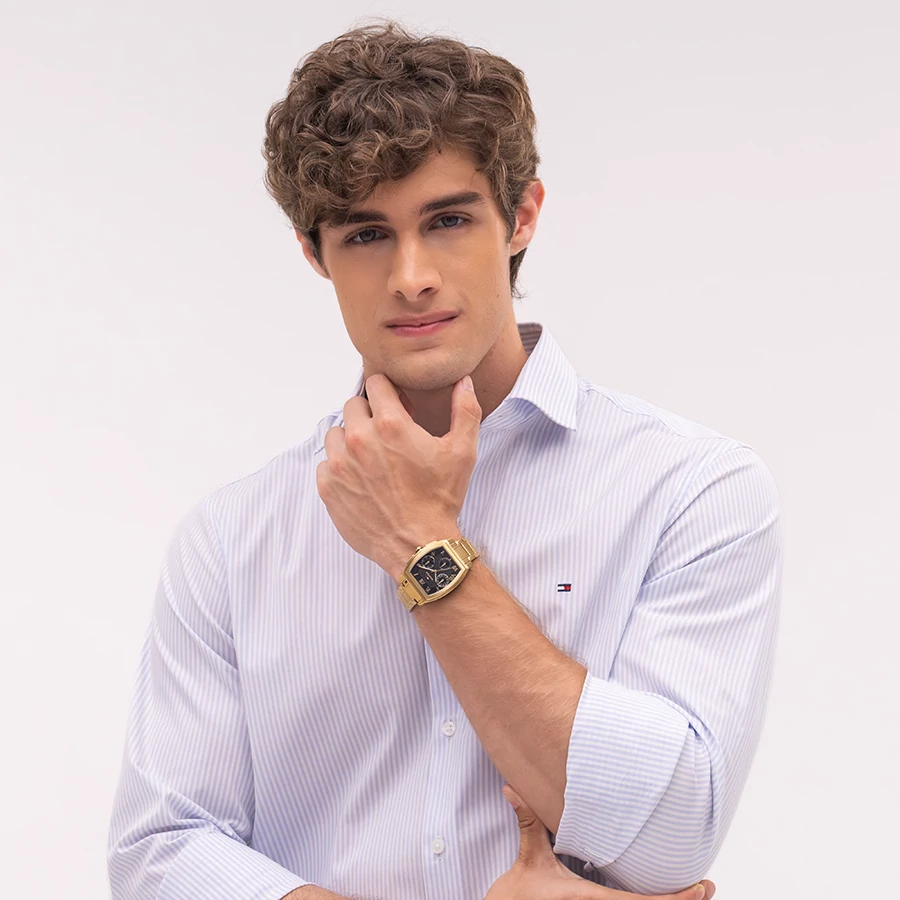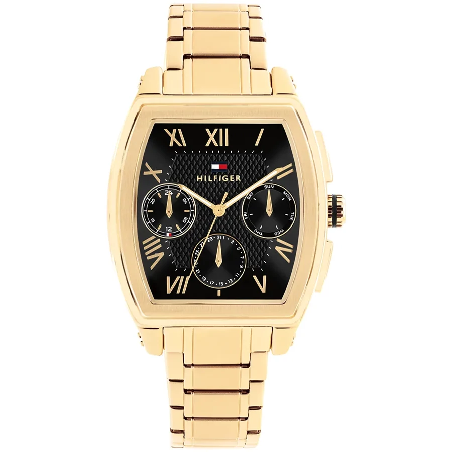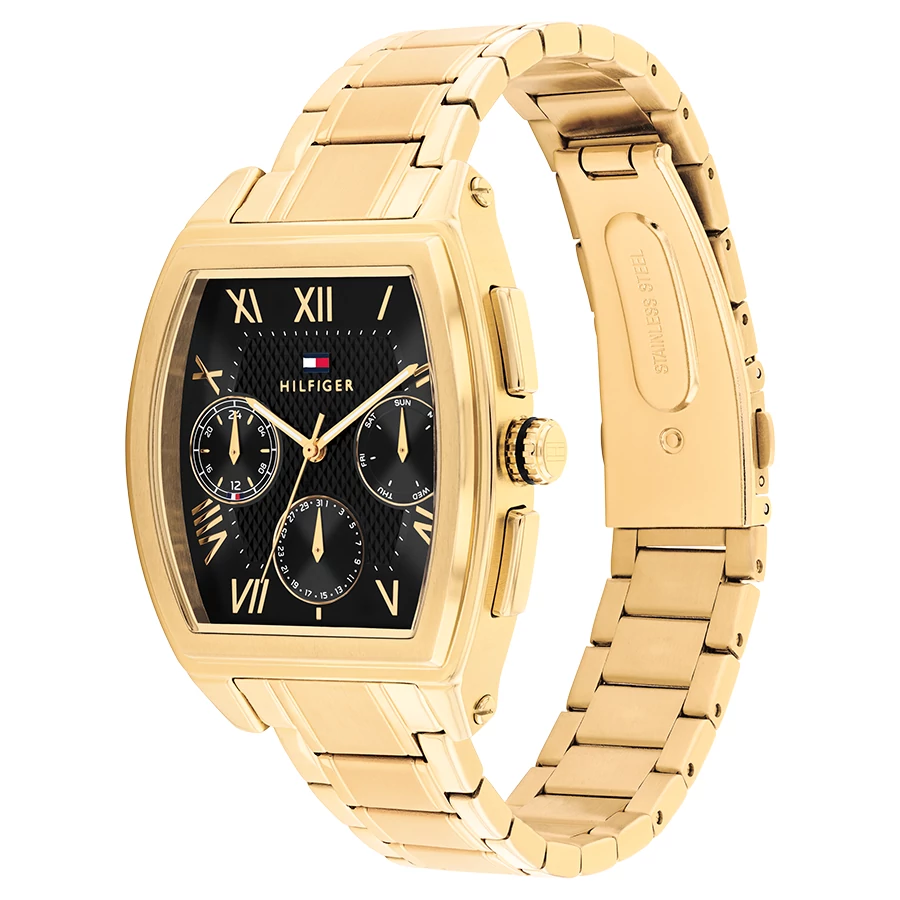 A TOMMY HILFIGER TH-OXFORD BTH17107643 karóra cseppálló, aranyszínű nemesacél tokkal, edzett kristályüveggel, aranyszínű acélcsattal, nyitáskönnyített csatközéppel készül. Az órát pontos quartz óraszerkezet működteti, mely elemmel működik (kb. 3 év az elem várható élettartama). Az óráról a pontos idő mellett leolvasható a nap, a nap neve és a 24-órás mutatóról a napszak is.