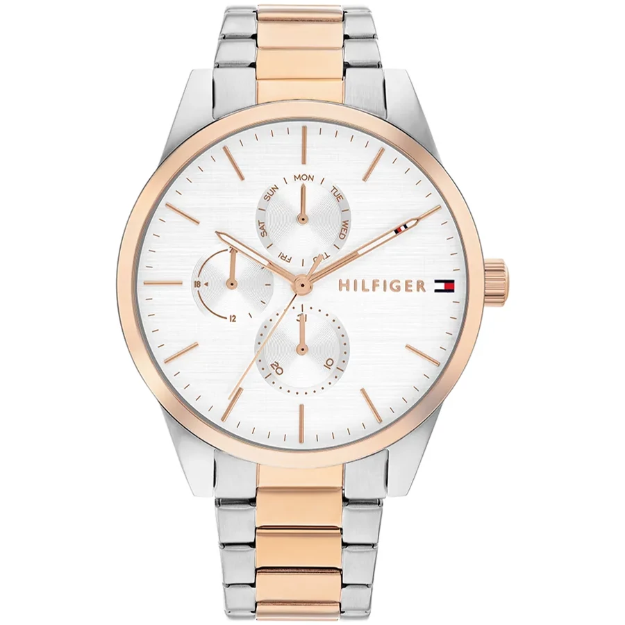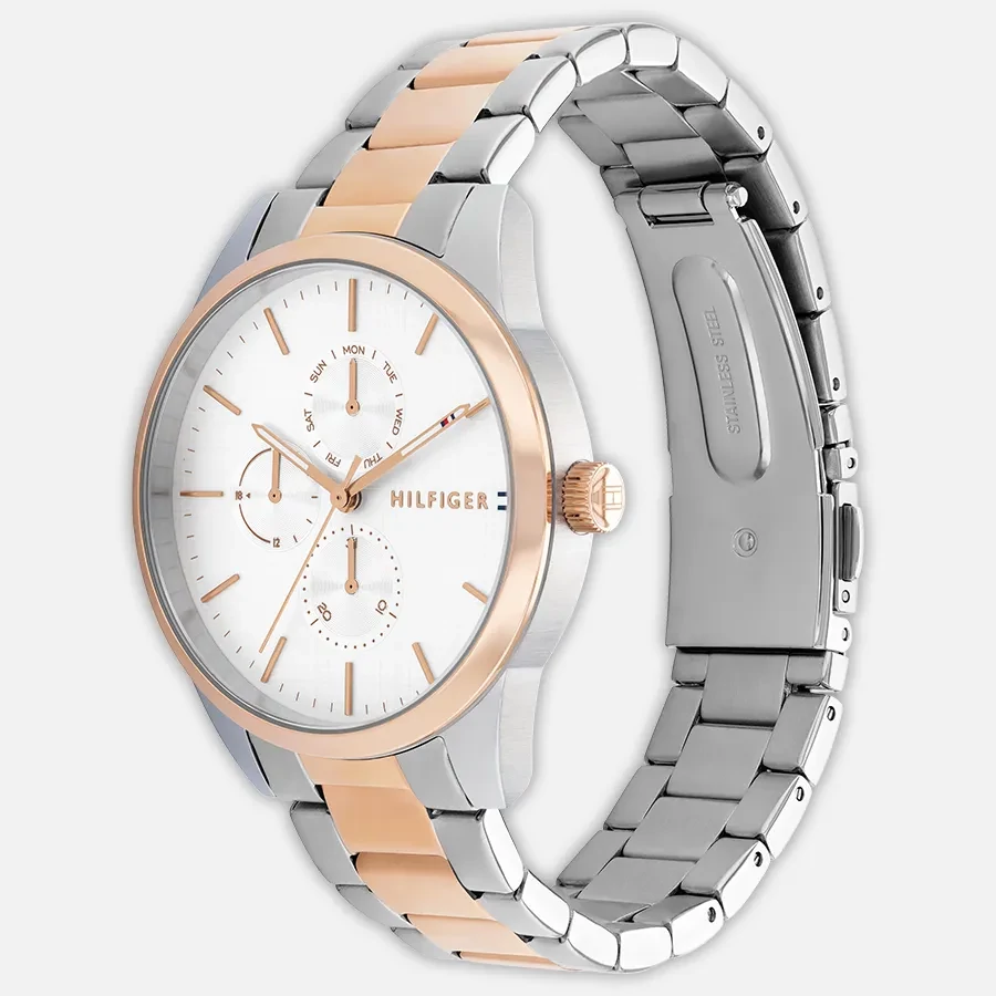 A TOMMY HILFIGER CAMILLE BTH17827683 karóra cseppálló, bicolor ( többszínű ) nemesacél tokkal, edzett kristályüveggel, bicolor ( többszínű ) acélcsattal, nyitáskönnyített csatközéppel készül. Az órát pontos quartz óraszerkezet működteti, mely elemmel működik (kb. 3 év az elem várható élettartama). Az óráról a pontos idő mellett leolvasható a nap, a nap neve és a 24-órás mutatóról a napszak is.