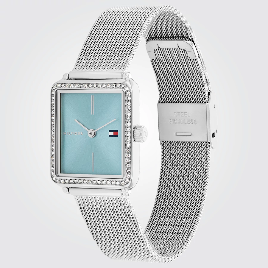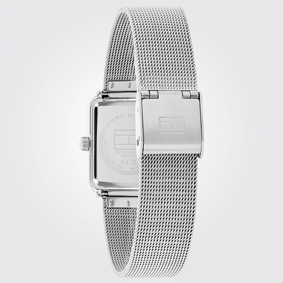 A TOMMY HILFIGER TEA SQUARE BTH17827893 karóra cseppálló, ezüstszínű nemesacél tokkal, edzett kristályüveggel, ezüstszínű acélcsattal, nyitáskönnyített csatközéppel készül. Az órát pontos quartz óraszerkezet működteti, mely elemmel működik (kb. 3 év az elem várható élettartama).