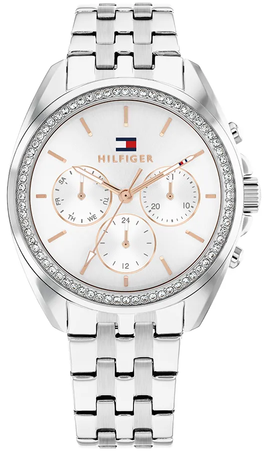 A TOMMY HILFIGER MELLIE BTH17828023 karóra 5 BAR nyomásig alapszinten vízálló, ezüstszínű nemesacél tokkal, edzett kristályüveggel, menetes hátlappal, ezüstszínű acélcsattal, nyitáskönnyített csatközéppel készül. Az órát pontos quartz óraszerkezet működteti, mely elemmel működik (kb. 3 év az elem várható élettartama). Az óráról a pontos idő mellett leolvasható a nap, a nap neve és a 24-órás mutatóról a napszak is.