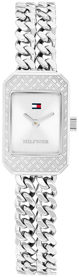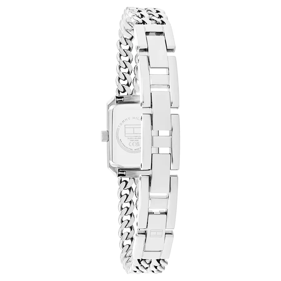 A TOMMY HILFIGER SARAH BTH17828413 karóra cseppálló, ezüstszínű nemesacél tokkal, edzett kristályüveggel, ezüstszínű tömör szemekből álló acélcsattal, ékszercsatolással készül. Az órát pontos quartz óraszerkezet működteti, mely elemmel működik (kb. 3 év az elem várható élettartama).