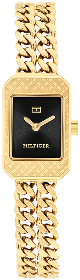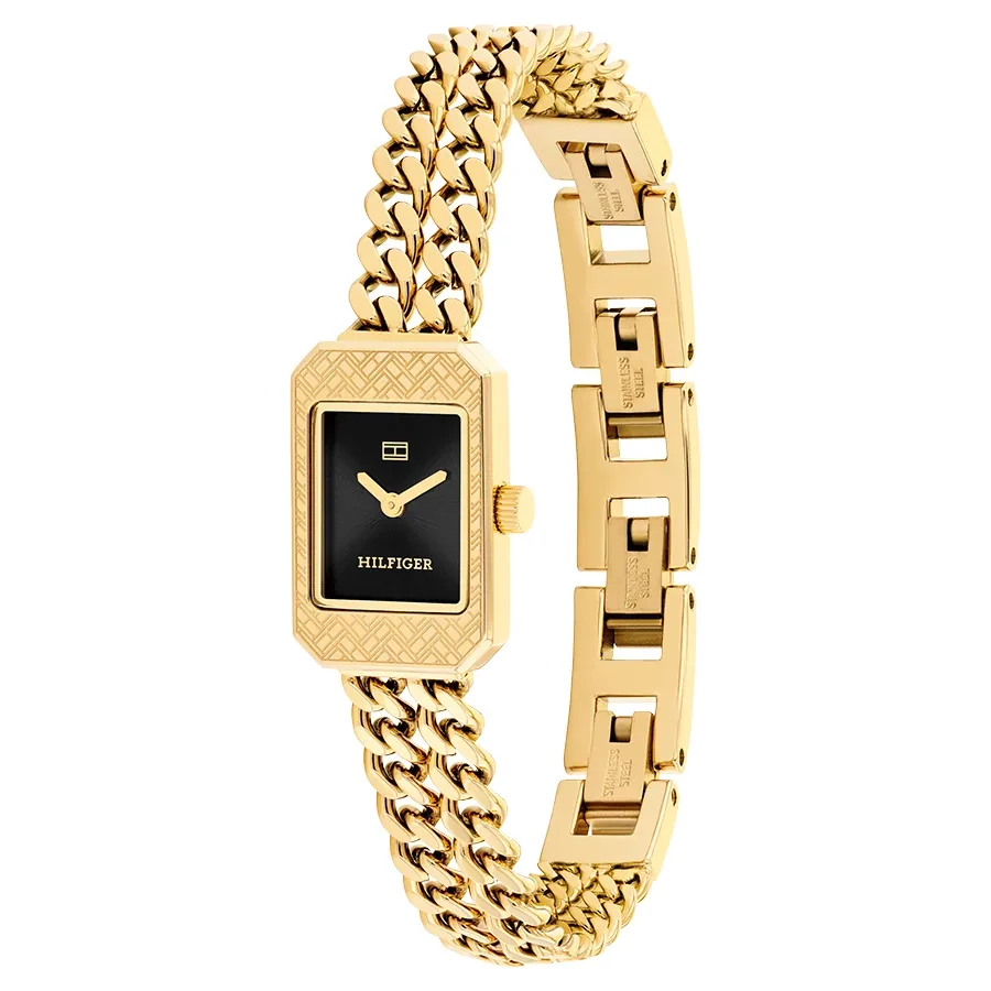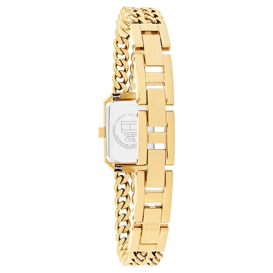 A TOMMY HILFIGER SARAH BTH17828423 karóra cseppálló, aranyszínű nemesacél tokkal, edzett kristályüveggel, aranyszínű tömör szemekből álló acélcsattal, ékszercsatolással készül. Az órát pontos quartz óraszerkezet működteti, mely elemmel működik (kb. 3 év az elem várható élettartama).