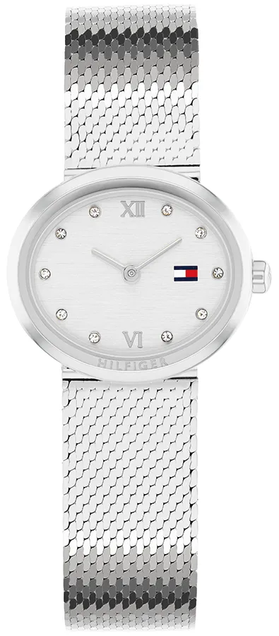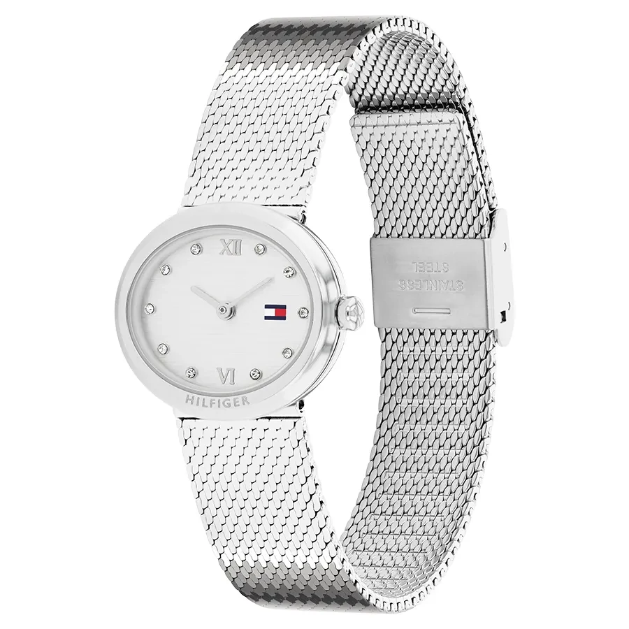 A TOMMY HILFIGER MOIRA BTH17828463 karóra cseppálló, ezüstszínű nemesacél tokkal, edzett kristályüveggel, ezüstszínű acélcsattal, nyitáskönnyített csatközéppel készül. Az órát pontos quartz óraszerkezet működteti, mely elemmel működik (kb. 3 év az elem várható élettartama).