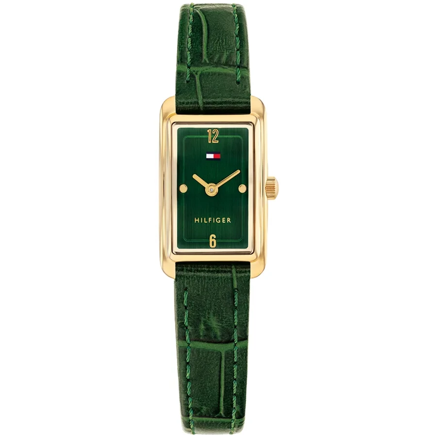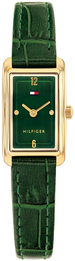 A TOMMY HILFIGER MADISON BTH17828503 karóra cseppálló, aranyszínű nemesacél tokkal, edzett kristályüveggel, zöld színű valódi bőrszíjjal készül. Az órát pontos quartz óraszerkezet működteti, mely elemmel működik (kb. 3 év az elem várható élettartama).