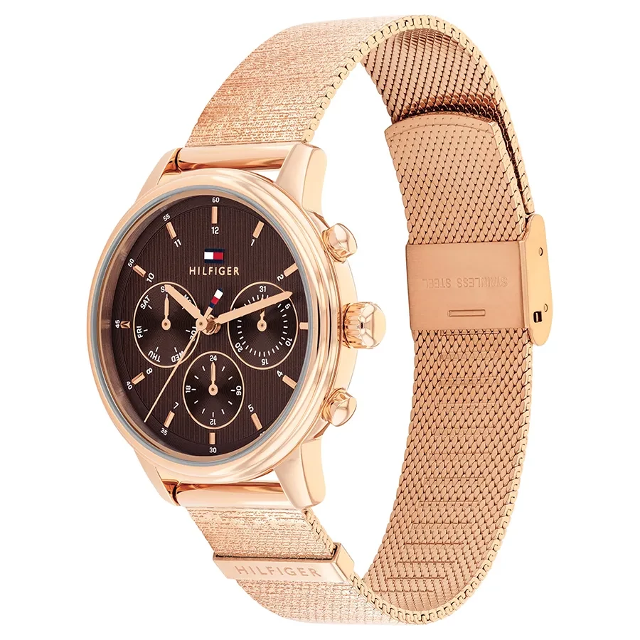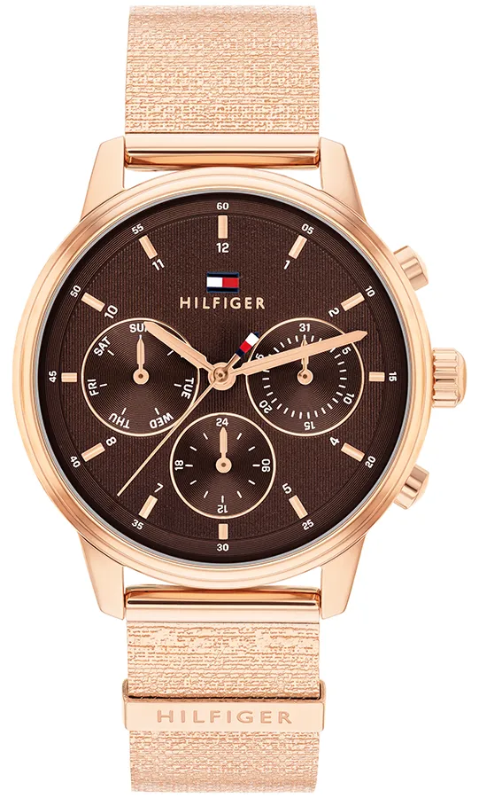 A TOMMY HILFIGER BLAKE MINI BTH17828643 karóra cseppálló, rozé ( rózsa arany ) színű nemesacél tokkal, edzett kristályüveggel, rozé ( rózsa arany ) színű acélcsattal, csúszkás csatközéppel készül. Az órát pontos quartz óraszerkezet működteti, mely elemmel működik. Az óráról a pontos idő mellett leolvasható a nap, a nap neve és a 24-órás mutatóról a napszak is.