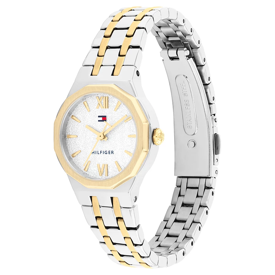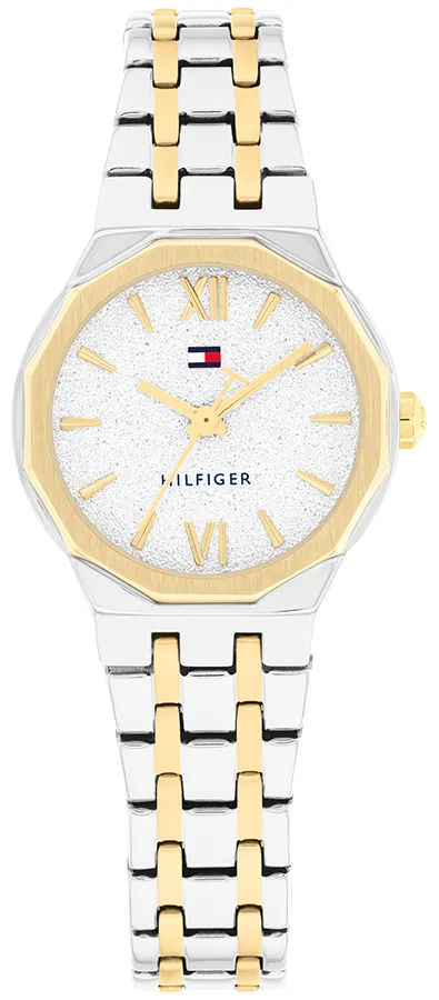 A TOMMY HILFIGER MACKENZIE BTH17828883 karóra cseppálló, bicolor ( többszínű ) nemesacél tokkal, edzett kristályüveggel, bicolor ( többszínű ) acélcsattal, nyitáskönnyített csatközéppel készül. Az órát pontos quartz óraszerkezet működteti, mely elemmel működik (kb. 3 év az elem várható élettartama).