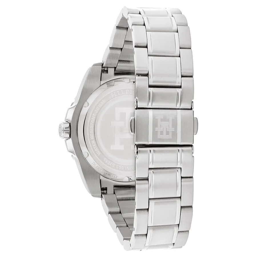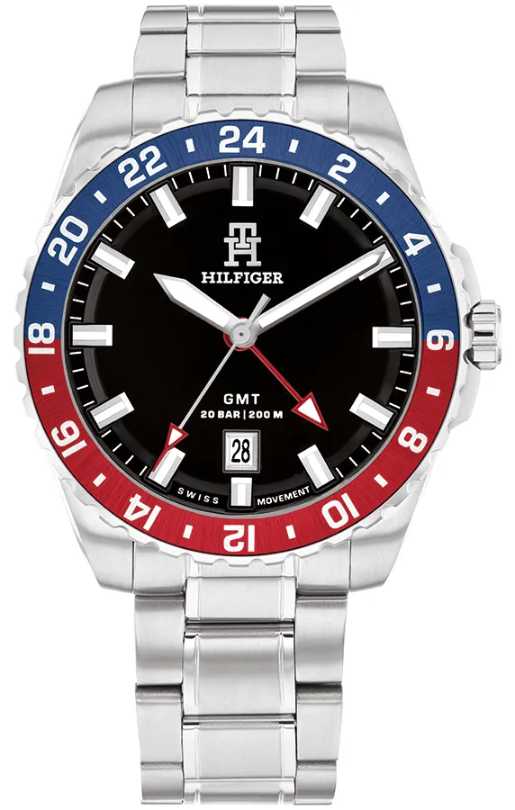 A TOMMY HILFIGER TH85 GMT BTH17921313 karóra 20 BAR nyomásig fokozottan vízálló, ezüstszínű nemesacél tokkal, edzett kristályüveggel, menetes koronával, menetes hátlappal, ezüstszínű acélcsattal, nyitáskönnyített csatközéppel készül. Az órát pontos quartz óraszerkezet működteti, mely elemmel működik (kb. 3 év az elem várható élettartama). Az óráról a pontos idő mellett leolvasható a nap is. Egy a pontos időtől független időzóna ideje is leolvasható az óráról (DUAL TIME).