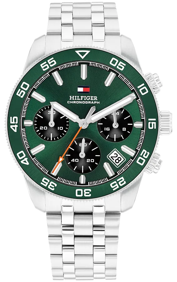 A TOMMY HILFIGER TH85 CHRONO BTH17922153 karóra 5 BAR nyomásig alapszinten vízálló, ezüstszínű nemesacél tokkal, edzett kristályüveggel, menetes hátlappal, ezüstszínű tömör szemekből álló acélcsattal, nyitáskönnyített csatközéppel készül. Az órát pontos quartz óraszerkezet működteti, mely elemmel működik (kb. 3 év az elem várható élettartama). Az óráról a pontos idő mellett leolvasható a nap is. 1/1 másodperces mérési egységű stoppert használhat maximum 30 perc mérési idővel. A stopper részidős mérést is lehetővé tesz.