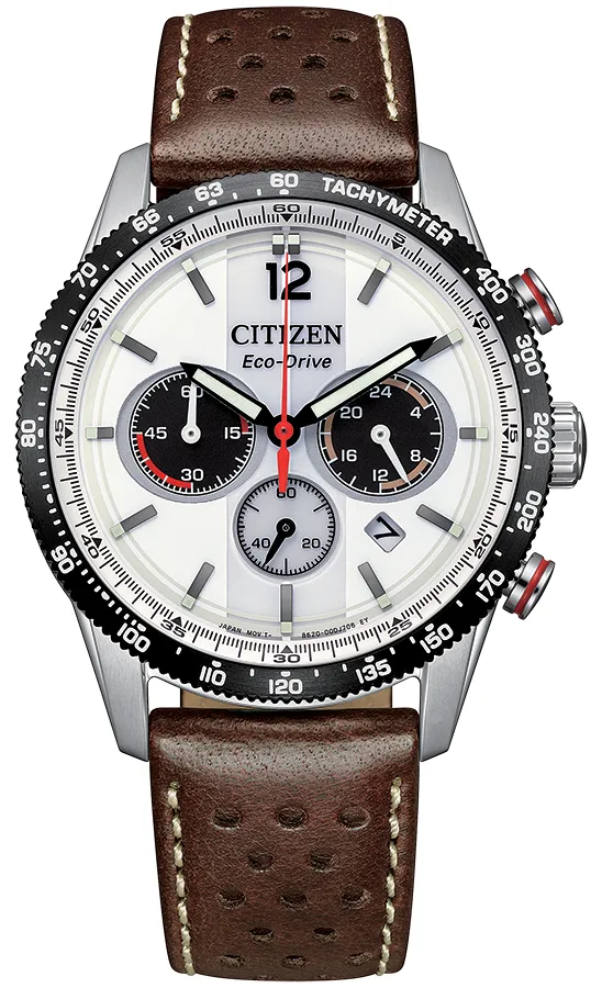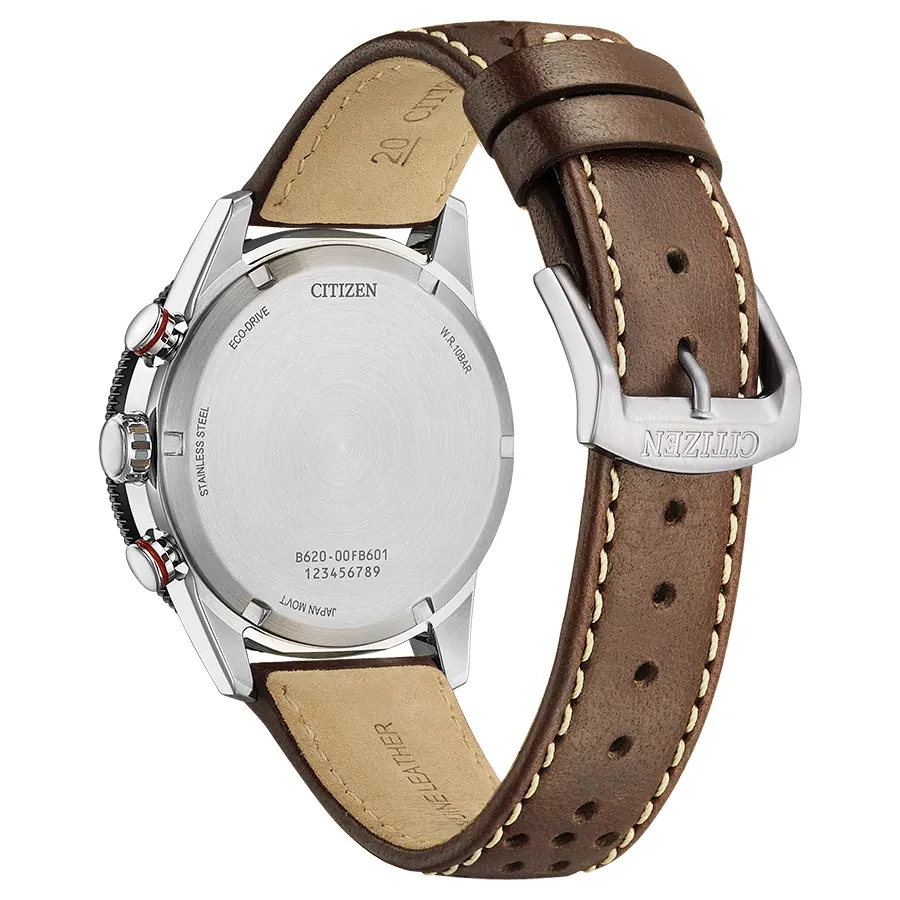 A CITIZEN CHRONO CA4714-04A karóra 10 BAR nyomásig fokozottan vízálló, ezüstszínű nemesacél tokkal, edzett kristályüveggel, menetes hátlappal, barna színű valódi bőrszíjjal készül. Az órát az Eco-Drive rendszernek köszönhetően kizárólag a fényből nyert energia működteti. Nyáron elég 1 nap "napozás" és a működését biztosító kondenzátor feltöltődik. A teljesen feltöltött kondenzátorral kb. 8 hónapig bírja, akár korom sötétben is. Az óráról a pontos idő mellett leolvasható a nap is. 1/5 másodperces mérési egységű stoppert használhat maximum 60 perc mérési idővel. A tachymeter skála segítségével megtudhatja az 1 kilométer alatti átlagsebességét.