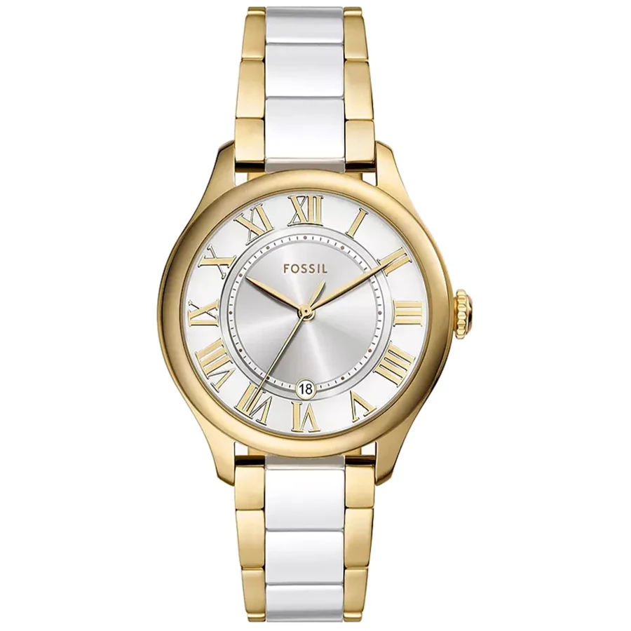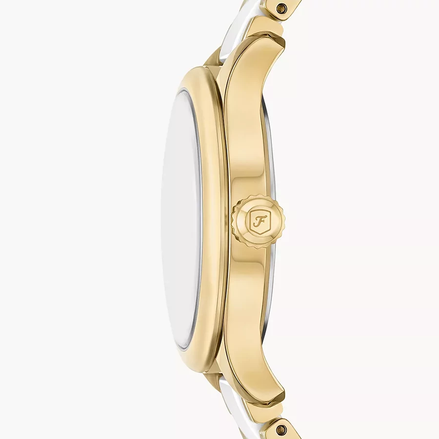 A FOSSIL GILMORE CE1131 karóra 5 BAR nyomásig alapszinten vízálló, aranyszínű nemesacél tokkal, edzett kristályüveggel, fehér színű kerámia csattal, nyitáskönnyített csatközéppel készül. Az órát pontos quartz óraszerkezet működteti, mely elemmel működik. Az óráról a pontos idő mellett leolvasható a nap is.