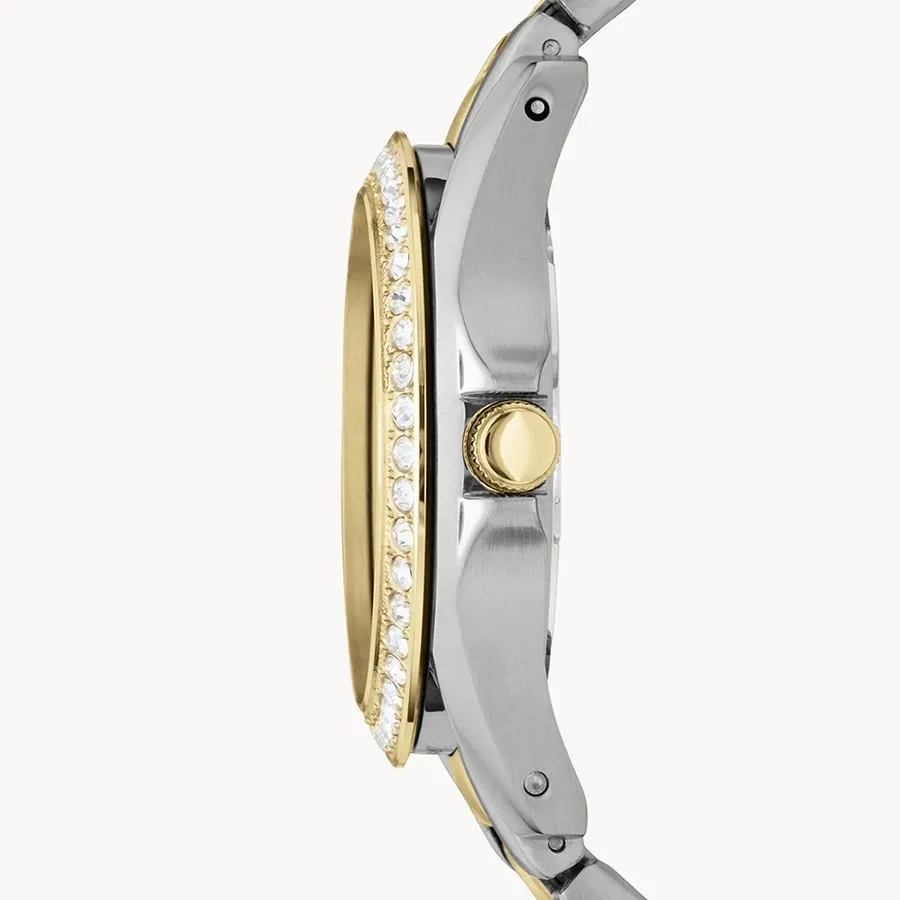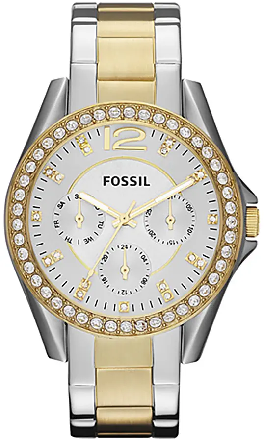 A FOSSIL RILEY ES3204 karóra 10 BAR nyomásig fokozottan vízálló, bicolor ( többszínű ) nemesacél tokkal, edzett kristályüveggel, bicolor ( többszínű ) acélcsattal, nyitáskönnyített csatközéppel készül. Az órát pontos quartz óraszerkezet működteti, mely elemmel működik. Az óráról a pontos idő mellett leolvasható a nap, a nap neve és a 24-órás mutatóról a napszak is.