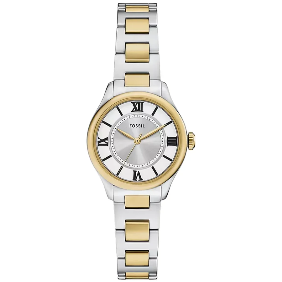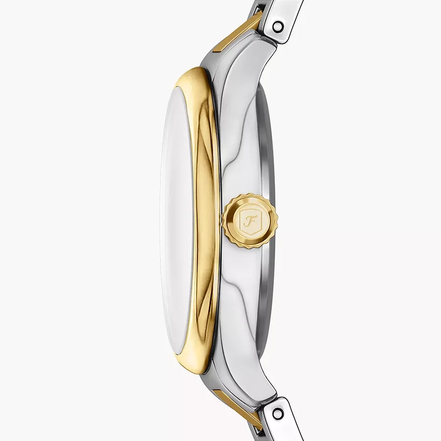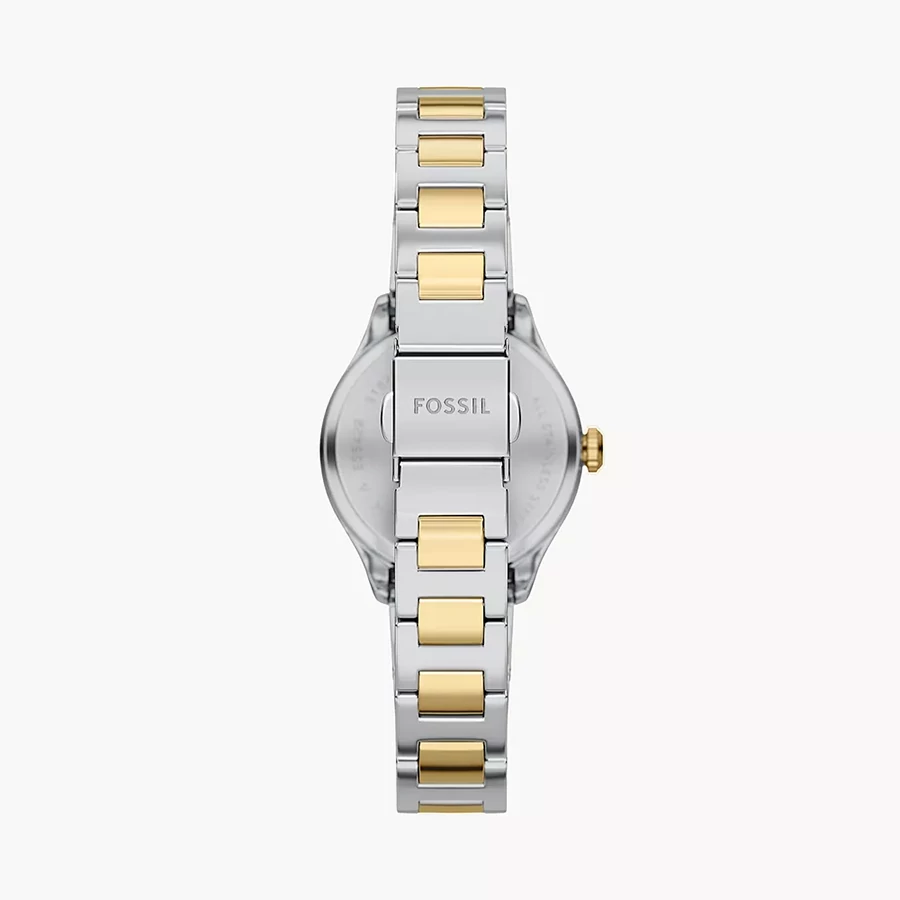A FOSSIL GILMORE MINI ES5422 karóra 5 BAR nyomásig alapszinten vízálló, bicolor ( többszínű ) nemesacél tokkal, edzett kristályüveggel, bicolor ( többszínű ) acélcsattal, nyitáskönnyített csatközéppel készül. Az órát pontos quartz óraszerkezet működteti, mely elemmel működik (kb. 3 év az elem várható élettartama).