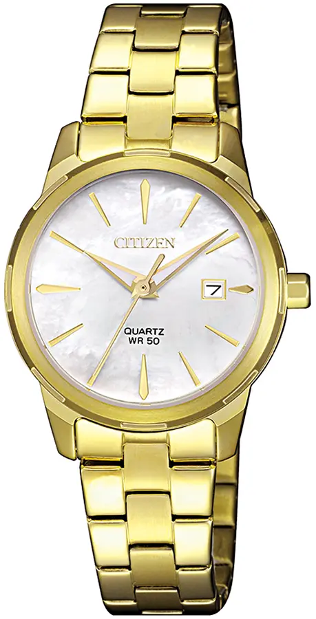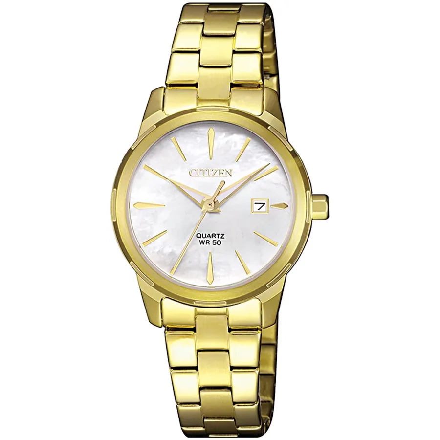 A CITIZEN ELEGANCE LADY EU6072-56D karóra 5 BAR nyomásig alapszinten vízálló, aranyszínű nemesacél tokkal, edzett kristályüveggel, aranyszínű acélcsattal, nyitáskönnyített csatközéppel készül. Az órát pontos quartz óraszerkezet működteti, mely elemmel működik (kb. 3 év az elem várható élettartama). Az óráról a pontos idő mellett leolvasható a nap is.