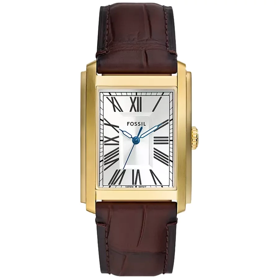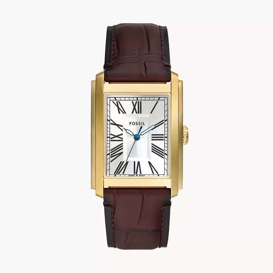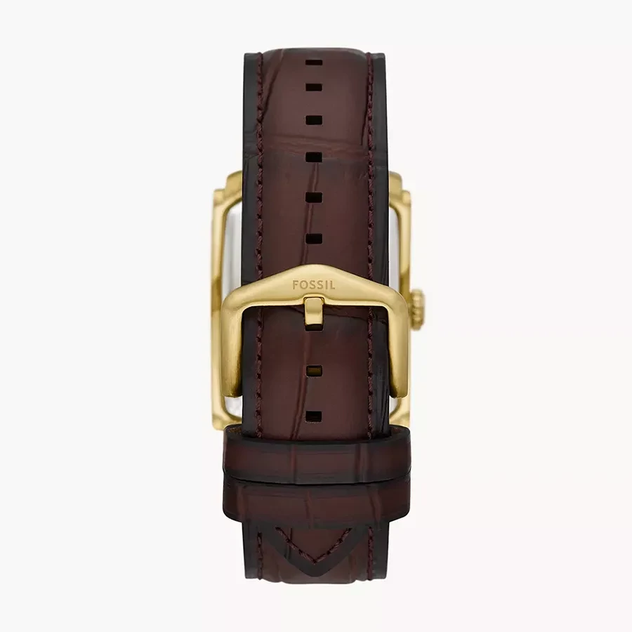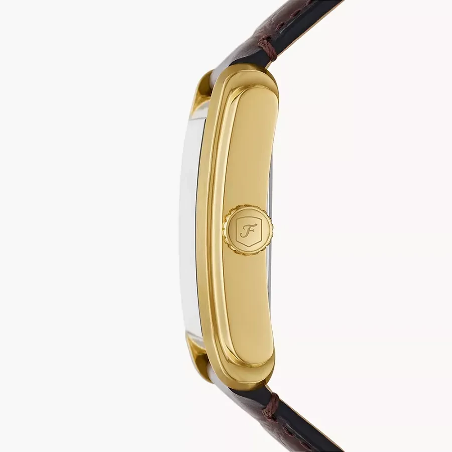 A FOSSIL CARRAWAY FS6011 karóra 5 BAR nyomásig alapszinten vízálló, aranyszínű nemesacél tokkal, edzett kristályüveggel, barna színű valódi bőrszíjjal készül. Az órát pontos quartz óraszerkezet működteti, mely elemmel működik.