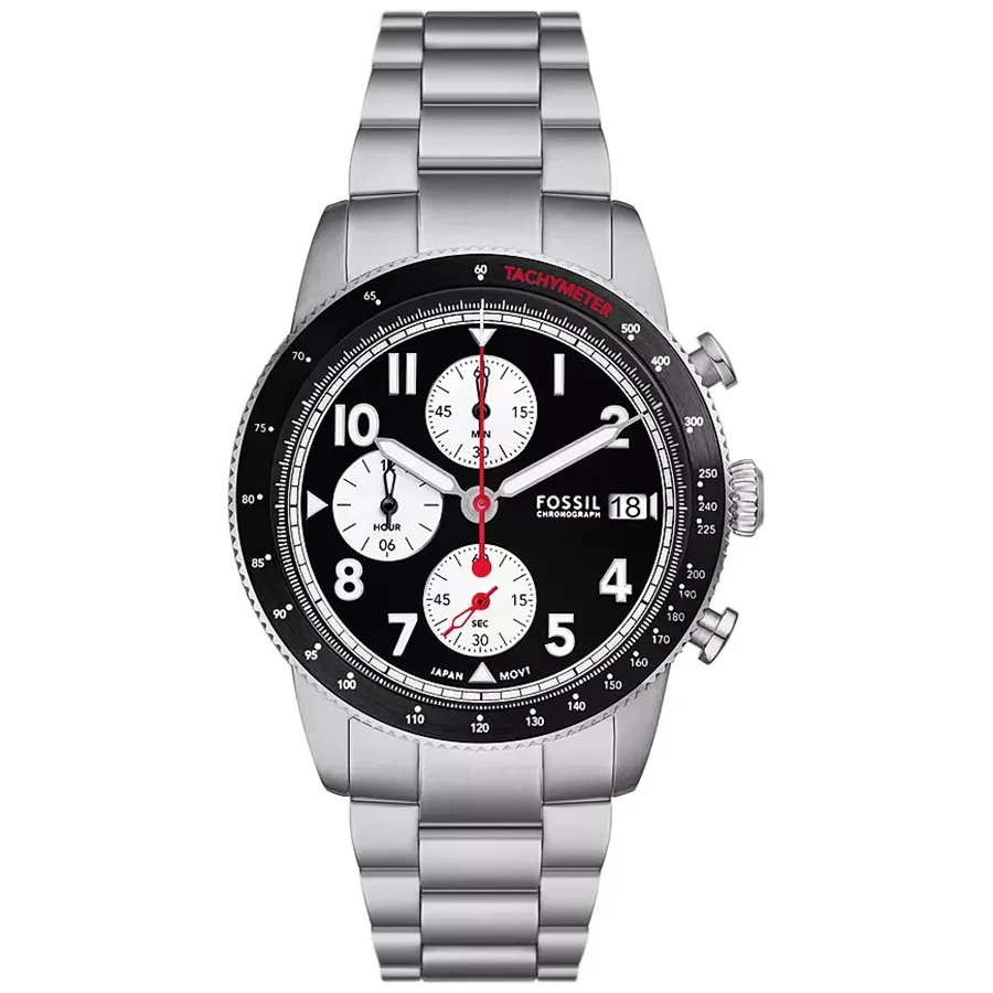 A FOSSIL SPORT TOURER CHRONO FS6045 karóra 5 BAR nyomásig alapszinten vízálló, ezüstszínű nemesacél tokkal, edzett kristályüveggel, menetes hátlappal, ezüstszínű acélcsattal, nyitáskönnyített csatközéppel készül. Az órát pontos quartz óraszerkezet működteti, mely elemmel működik. Az óráról a pontos idő mellett leolvasható a nap is. 1/1 másodperces mérési egységű stoppert használhat maximum 12 óra mérési idővel. A tachymeter skála segítségével megtudhatja az 1 kilométer alatti átlagsebességét.