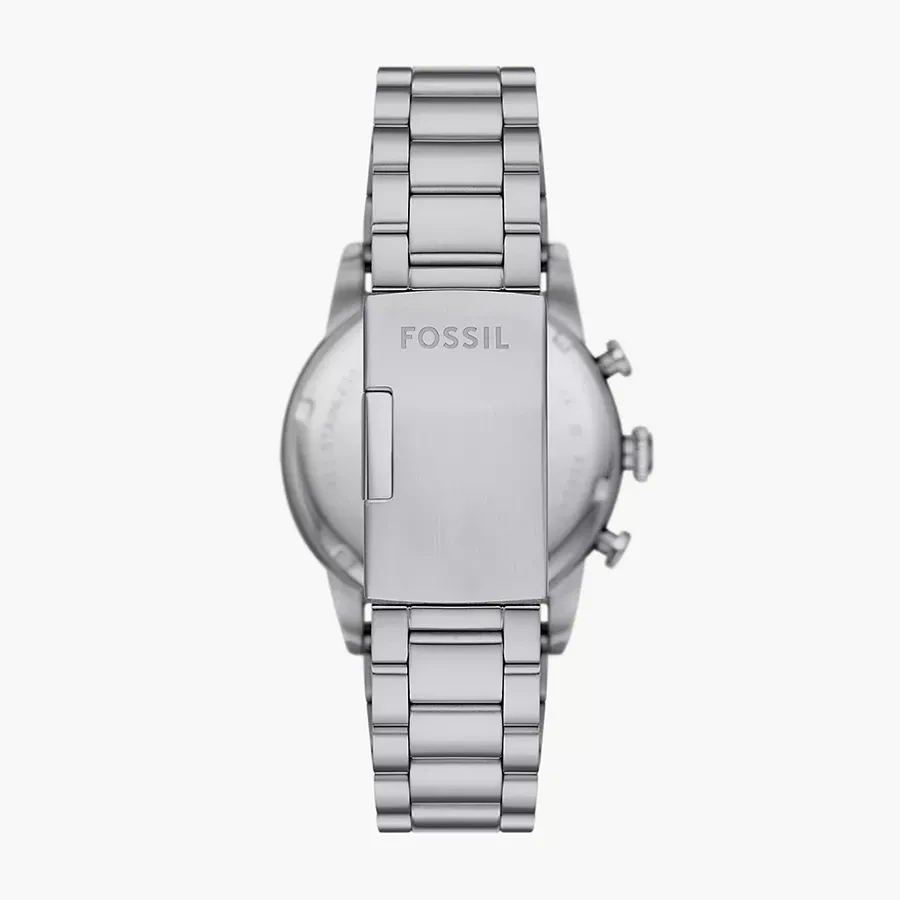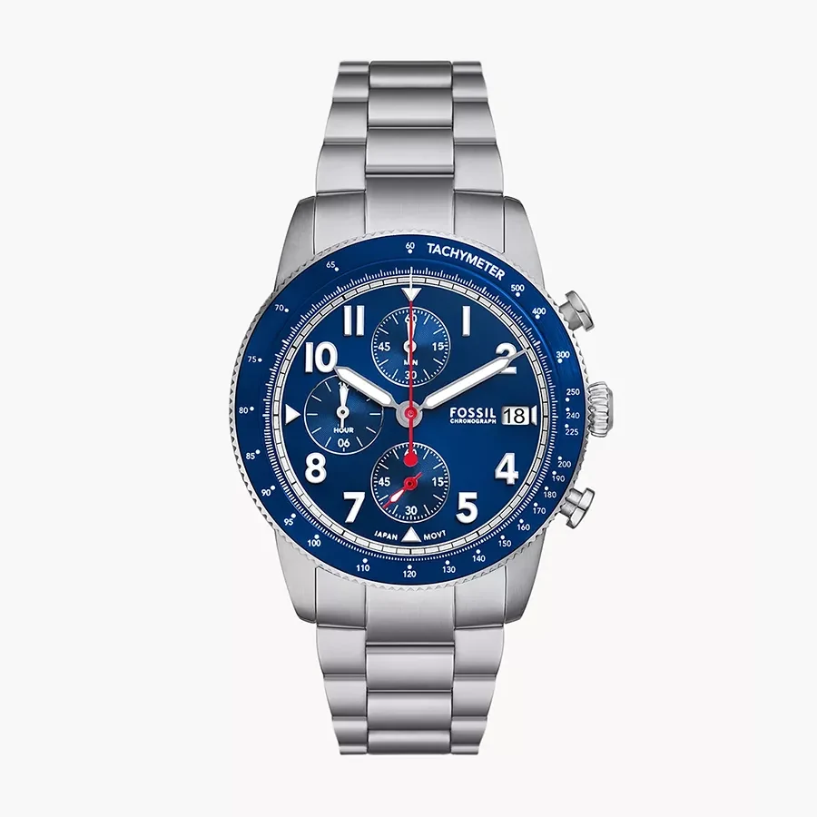 A FOSSIL SPORT TOURER CHRONO FS6047 karóra 5 BAR nyomásig alapszinten vízálló, ezüstszínű nemesacél tokkal, edzett kristályüveggel, menetes hátlappal, ezüstszínű acélcsattal, nyitáskönnyített csatközéppel készül. Az órát pontos quartz óraszerkezet működteti, mely elemmel működik. Az óráról a pontos idő mellett leolvasható a nap is. 1/1 másodperces mérési egységű stoppert használhat maximum 12 óra mérési idővel. A tachymeter skála segítségével megtudhatja az 1 kilométer alatti átlagsebességét.