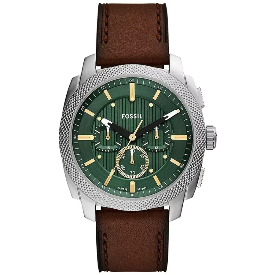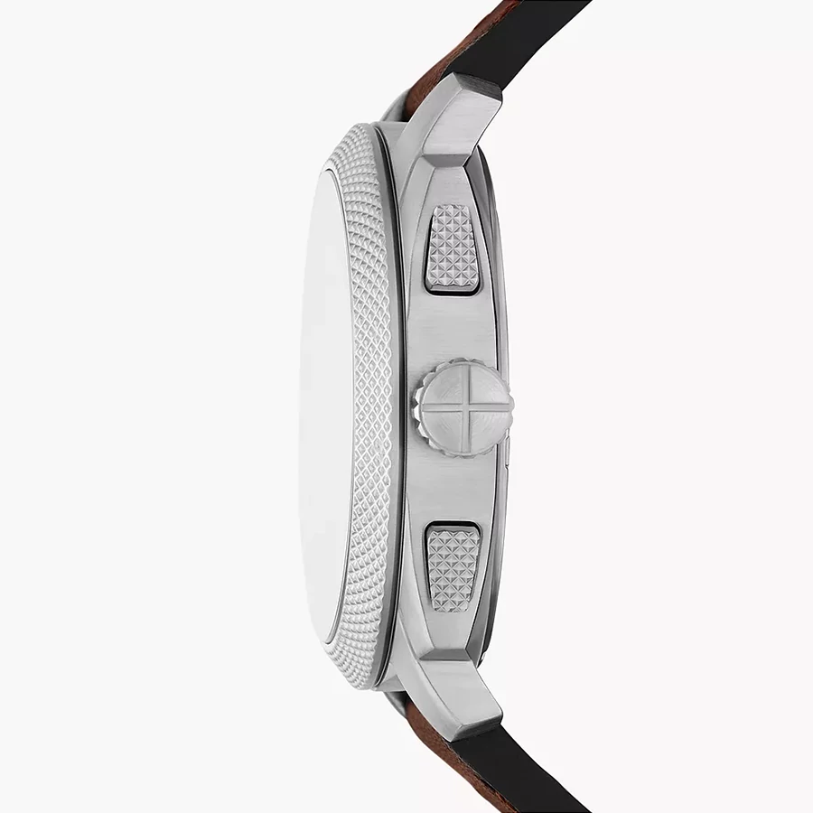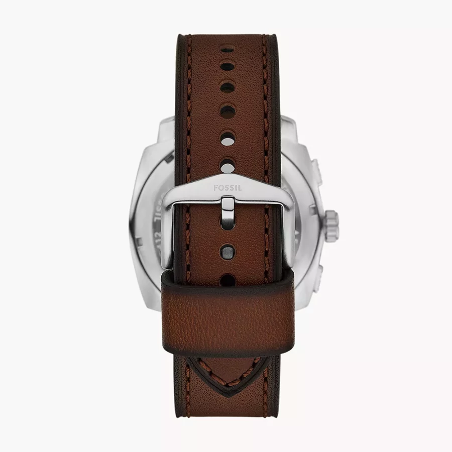 A FOSSIL MACHINE II FS6100 karóra 5 BAR nyomásig alapszinten vízálló, ezüstszínű nemesacél tokkal, edzett kristályüveggel, menetes hátlappal, barna színű valódi bőrszíjjal készül. Az órát pontos quartz óraszerkezet működteti, mely elemmel működik. Az óráról a pontos idő mellett leolvasható a nap is. 1/1 másodperces mérési egységű stoppert használhat maximum 30 perc mérési idővel.