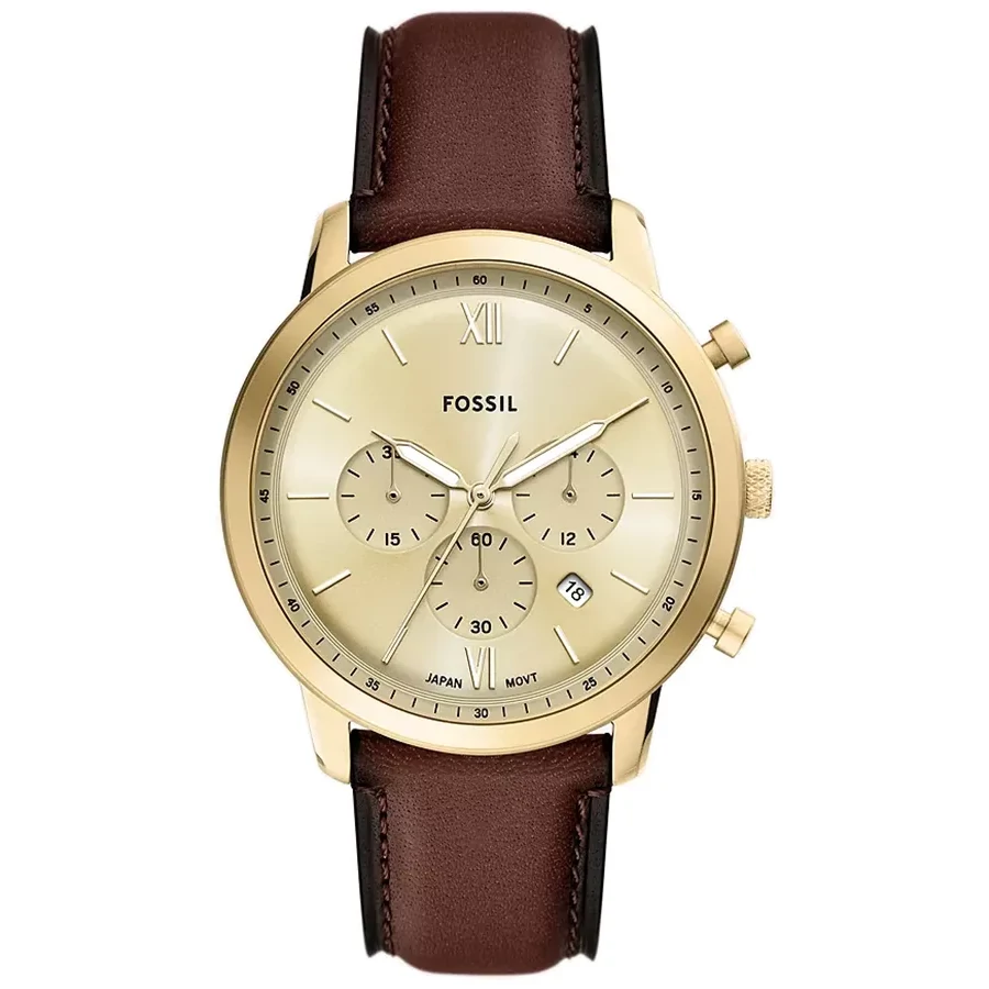A FOSSIL NEUTRA CHRONOGRAPH FS6113 karóra 5 BAR nyomásig alapszinten vízálló, aranyszínű nemesacél tokkal, edzett kristályüveggel, barna színű valódi bőrszíjjal készül. Az órát pontos quartz óraszerkezet működteti, mely elemmel működik. Az óráról a pontos idő mellett leolvasható a nap is. 1/1 másodperces mérési egységű stoppert használhat maximum 30 perc mérési idővel.