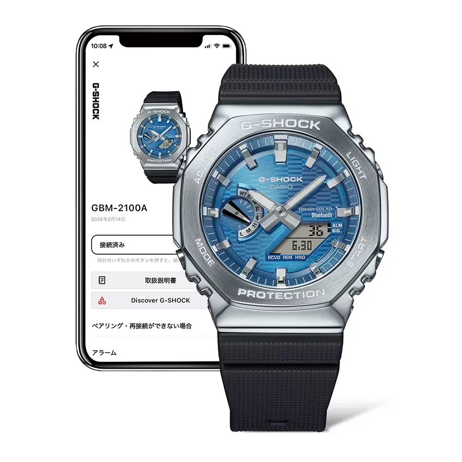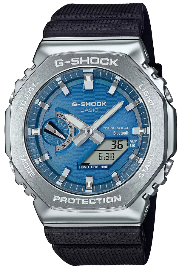 A CASIO G-SHOCK GBM-2100A-2B karóra 20 BAR nyomásig fokozottan vízálló, fokozottan ütés- és rezgésálló, ezüstszínű acél rámás műanyag tokkal, edzett kristályüveggel, fekete színű műanyagszíjjal készül. Android és IOS operációs rendszerű telefonokkal Bluetooth kapcsolaton keresztül képes szinkronizálnia magát az "atompontos" NTP szerverek idejéhez. A TOUGH SOLAR szerkezetet a fényből nyert energia táplálja, nyáron elég 1 nap "napozás" és a működését biztosító akkumulátor feltöltődik. A teljesen feltöltött akkumulátorral 6 hónapig bírja, akár korom sötétben is. 1/100 másodperces mérési egységű stoppert használhat maximum 24 óra mérési idővel. A stopper részidős mérést is lehetővé tesz. A visszaszámláló riasztásnál a maximálisan beállítható visszaszámlálandó időtartam 1 óra. Az órán öt egymástól független napi ébresztés használható, ez minden nap - ha bekapcsolja - az ébresztési időpont elérésekor jelez. Az óra a városkód kiválasztása után azonnal megjeleníti az ottani zónaidőt. Az óra BLUETOOTH kapcsolaton keresztül képes kapcsolódni okostelefonokhoz. A PHONE FINDER segítségével megtalálhatja a telefonját. Gombnyomásra LED LIGHT technológiával világítja meg az óra a számlapot.
