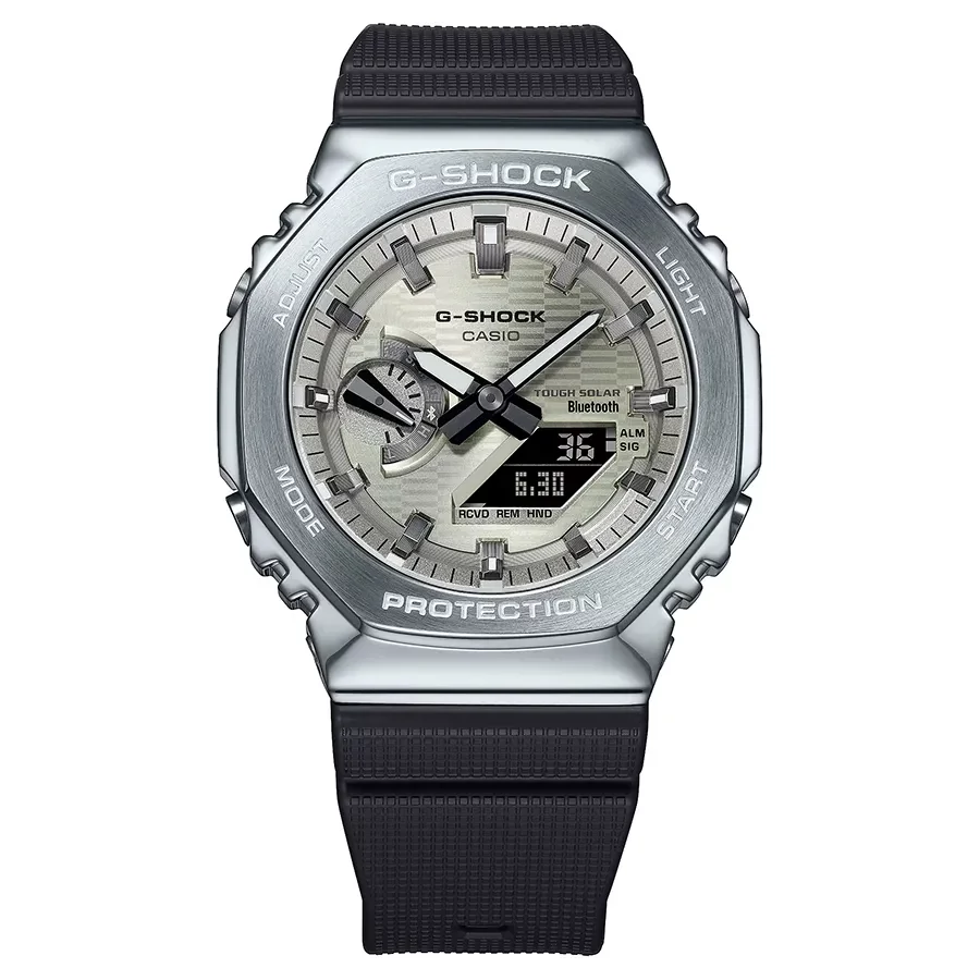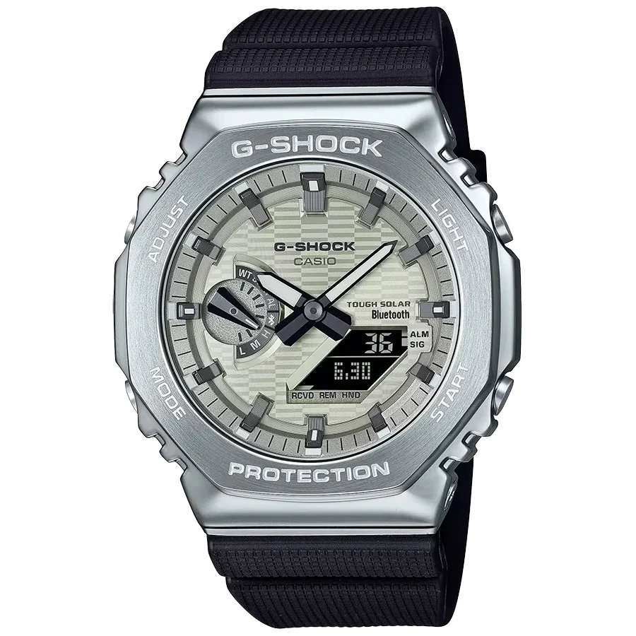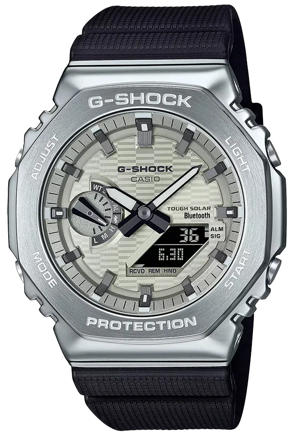 A CASIO G-SHOCK GBM-2100A-8B karóra 20 BAR nyomásig fokozottan vízálló, fokozottan ütés- és rezgésálló, ezüstszínű acél rámás műanyag tokkal, edzett kristályüveggel, fekete színű műanyagszíjjal készül. Android és IOS operációs rendszerű telefonokkal Bluetooth kapcsolaton keresztül képes szinkronizálnia magát az "atompontos" NTP szerverek idejéhez. A TOUGH SOLAR szerkezetet a fényből nyert energia táplálja, nyáron elég 1 nap "napozás" és a működését biztosító akkumulátor feltöltődik. A teljesen feltöltött akkumulátorral 6 hónapig bírja, akár korom sötétben is. 1/100 másodperces mérési egységű stoppert használhat maximum 24 óra mérési idővel. A stopper részidős mérést is lehetővé tesz. A visszaszámláló riasztásnál a maximálisan beállítható visszaszámlálandó időtartam 1 óra. Az órán öt egymástól független napi ébresztés használható, ez minden nap - ha bekapcsolja - az ébresztési időpont elérésekor jelez. Az óra a városkód kiválasztása után azonnal megjeleníti az ottani zónaidőt. Az óra BLUETOOTH kapcsolaton keresztül képes kapcsolódni okostelefonokhoz. A PHONE FINDER segítségével megtalálhatja a telefonját. Gombnyomásra LED LIGHT technológiával világítja meg az óra a számlapot.