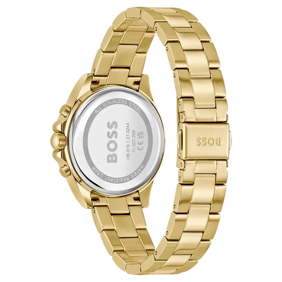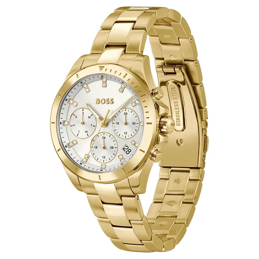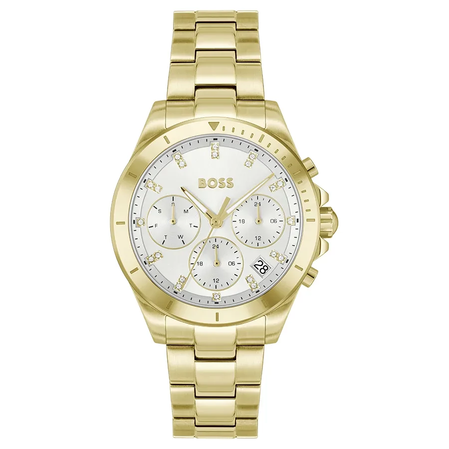 A HUGO BOSS ALLEY HB1502829 karóra cseppálló, aranyszínű nemesacél tokkal, edzett kristályüveggel, aranyszínű tömör szemekből álló acélcsattal, nyitáskönnyített csatközéppel készül. Az órát pontos quartz óraszerkezet működteti, mely elemmel működik (kb. 3 év az elem várható élettartama). Az óráról a pontos idő mellett leolvasható a nap is. Egy a pontos időtől független időzóna ideje is leolvasható az óráról (DUAL TIME).