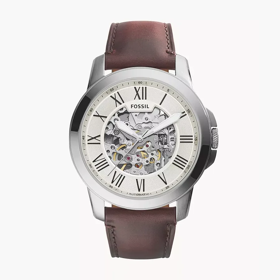 A FOSSIL DRESS GRANT AUTOMATIC ME3099 karóra 5 BAR nyomásig alapszinten vízálló, ezüstszínű nemesacél tokkal, domború edzett kristályüveggel, menetes hátlappal, barna színű valódi bőrszíjjal készül. A mechanikus szerkezetet egy rugó működteti, melyet a kéz mozgása húz fel automatikusan. A megbízható működés eléréséhez kb. 8 óra aktív mozgásra van szükség.