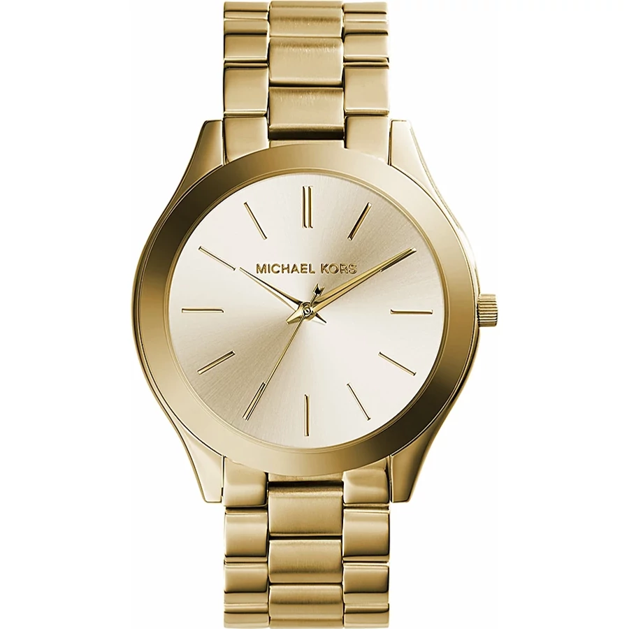 A MICHAEL KORS SLIM RUNWAY MK3179 karóra 5 BAR nyomásig alapszinten vízálló, aranyszínű nemesacél tokkal, edzett kristályüveggel, aranyszínű valódi bőrszíjjal készül. Az órát pontos quartz óraszerkezet működteti, mely elemmel működik.